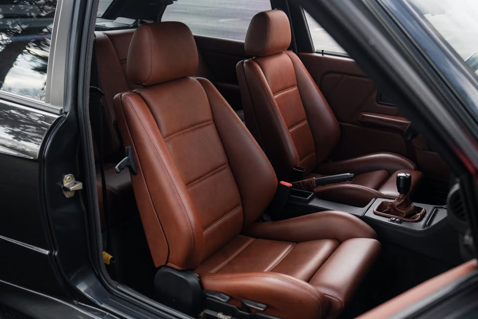 All glass is original and in excellent condition, retaining OEM markings throughout. The windshield has a small chip on the passenger side, but it remains original. Minor cosmetic imperfections include a small scratch on the driver’s-side rear quarter panel and a touched-up rock chip on the hood. Motorsport heritage is tastefully acknowledged with a BMW Motorsport windshield banner and a set of DTM-style mirrors, sourced from a European race team that raced E30 M3’s during the glory days of DTM (Original mirrors are included.) Overall, the exterior presence is purposeful, authentic, and unmistakably special.