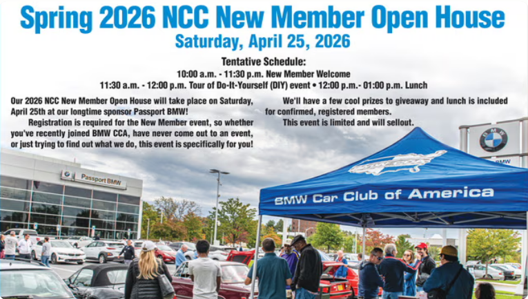We are excited to announce our 2026 NCC New Member Open House will take place on Saturday, April 25th at the newly renovated Passport BMW! Registration is required for the New Member event, so whether you've recently joined BMW CCA, have never come out to an event, or just trying to find out what we do, this event is specifically for you! As the largest CCA chapter with 4000+ members locally, we have the most active and most diverse membership base you'll ever come across. We will have all of our program heads present, so this is the perfect opportunity to meet your fellow BMW enthusiasts, answer your questions, and give you a taste of all the events we run throughout the year. We guarantee we have something for track rats, wrench turners, motorsport fans, all BMW enthusiasts, and, of course, the ladies! We'll have a few cool prizes to giveaway and lunch is included for registered members. As an added bonus, we'll have an NCC Do-It-Yourself (DIY) event going on in the service area. We will take a visit of the live DIY event, then have a big combined lunch with all other members.