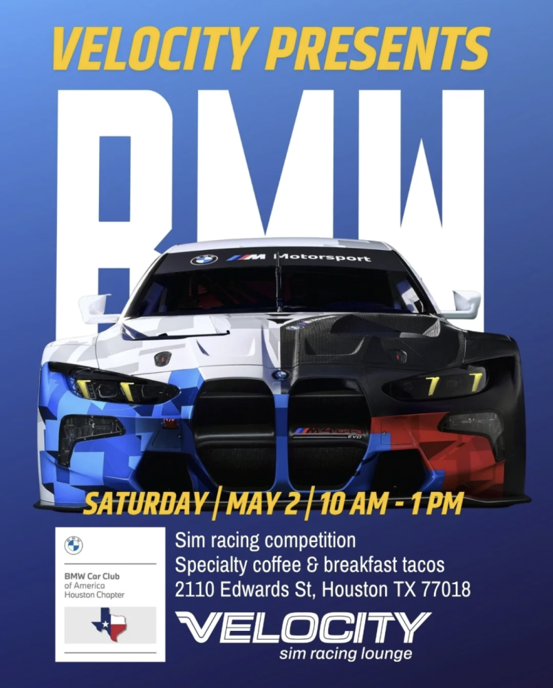 Kick off your Saturday with the Houston BMW CCA at Velocity Sim Racing Lounge. Enjoy a high-energy sim racing competition alongside specialty coffee and breakfast tacos in a relaxed, welcoming environment.