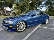 For sale is a 2002 BMW 330ci (E46) with 214,675 miles, a 5-speed manual transmission, and a blue exterior over tan interior. This enthusiast-owned car has been meticulously maintained with full records and tastefully modified with Bilstein shocks, H&R springs, shock tower reinforcement plates, an AC Schnitzer front strut tower brace, extended wheel studs, and a popular Dynavin head unit. It runs and drives well, with suspension and chassis upgrades that make it an engaging yet comfortable car. Some rust is present over the rear wheel arches (common for the E46), but overall, the car is solid and well-kept for its age. Asking $8,500 or best offer