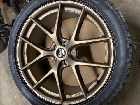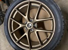 Set of 4. Color is bronze. Staggered set with 275/35R-20 in front, 285/35R-20 rear. Front rims are 9” wide, rears are 10” wide. Centering rings and compatible lug nuts included. Equipped with TPMS. Absolutely mint condition. Never touched a curb, etc. Never touched up. They have 13,838 miles on them, from the last several winters. Plenty of tread life left.