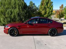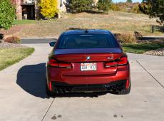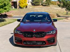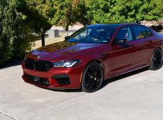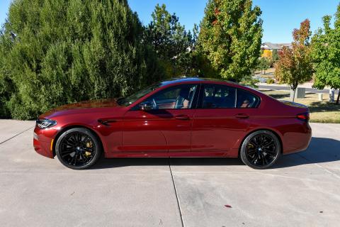 This 2023 BMW M5 was purchased new through Schomp BMW in Highlands Ranch, Colorado, with over $31k in optional equipment. Finished in Aventurin Red Metallic over Tartufo Full Merino leather upholstery, the car is powered by a twin-turbocharged 4.4-liter V8 that drives all four wheels through an eight-speed automatic transmission, an M xDrive all-wheel-drive system, and an Active M rear differential. Optional equipment includes the Competition ($7,600), Executive ($3,450), and Driving Assistance Pro ($1,700) packages as well as carbon-ceramic brakes ($8,500), Tartufo Full Merino leather ($5,000), Bowers & Wilkins sound system ($3,400), and Aventurin Red Metallic paint ($1,950). The total MSRP of this car was $143,495.