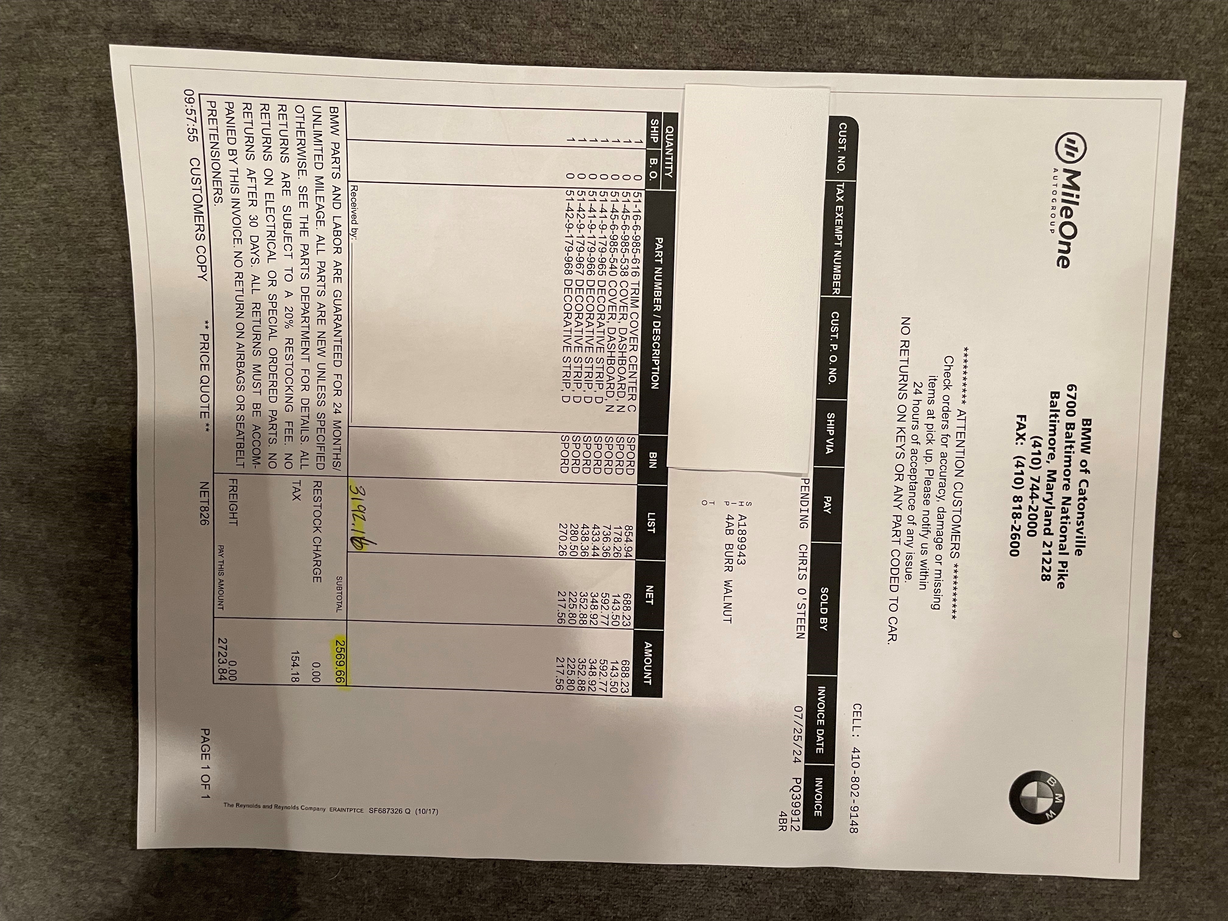 Invoice shows part numbers; List Price $3,192.16; Employee Price $2,569.66