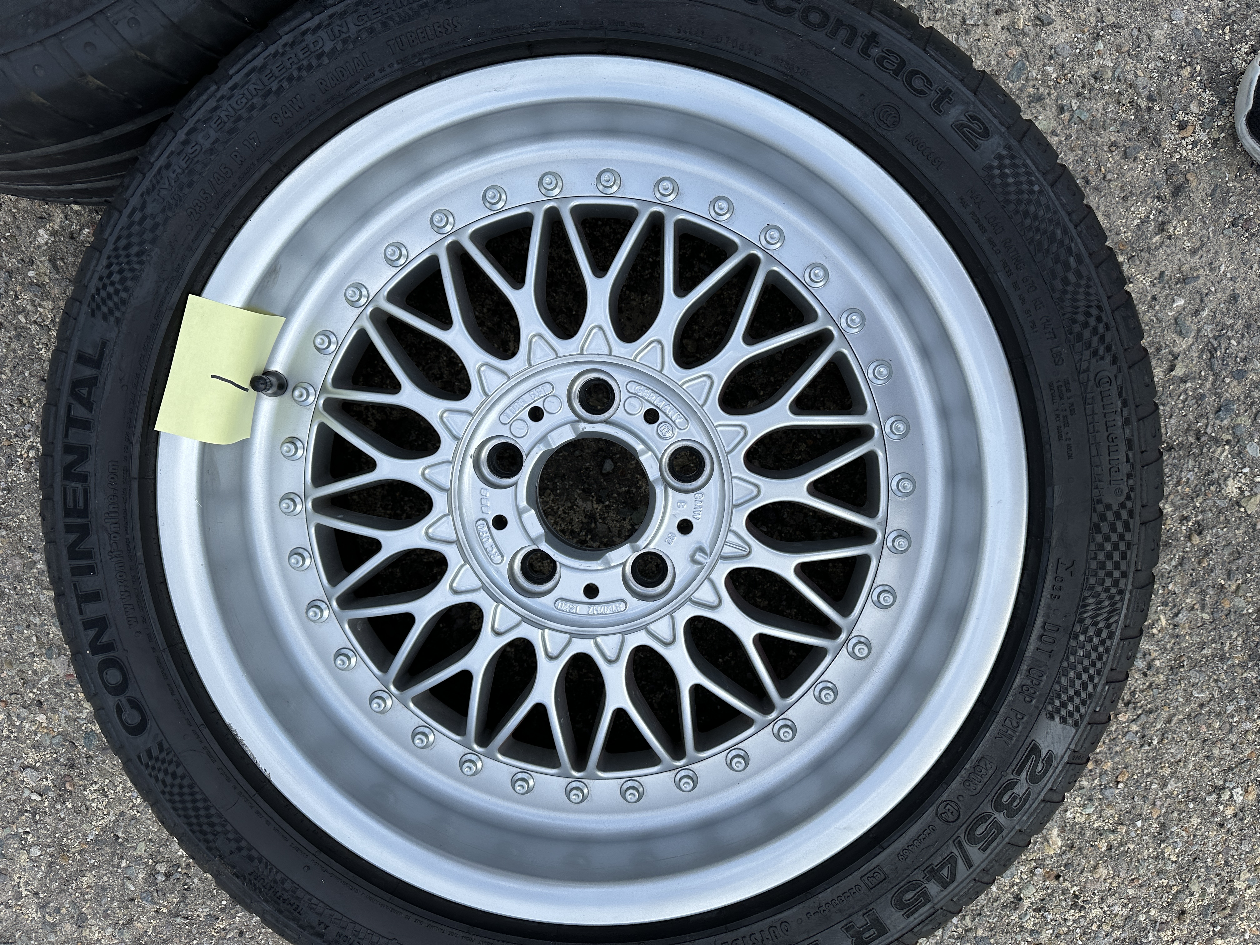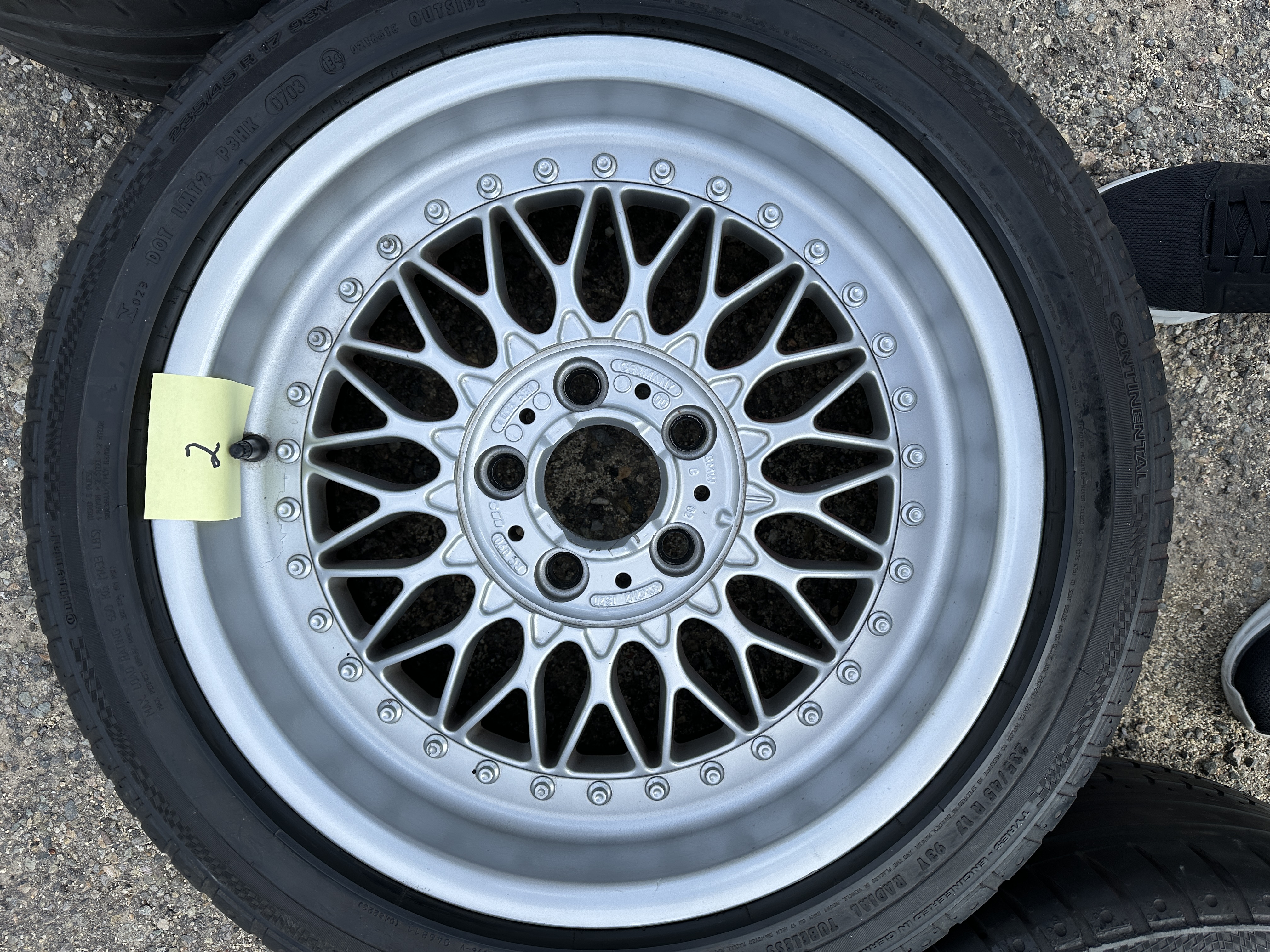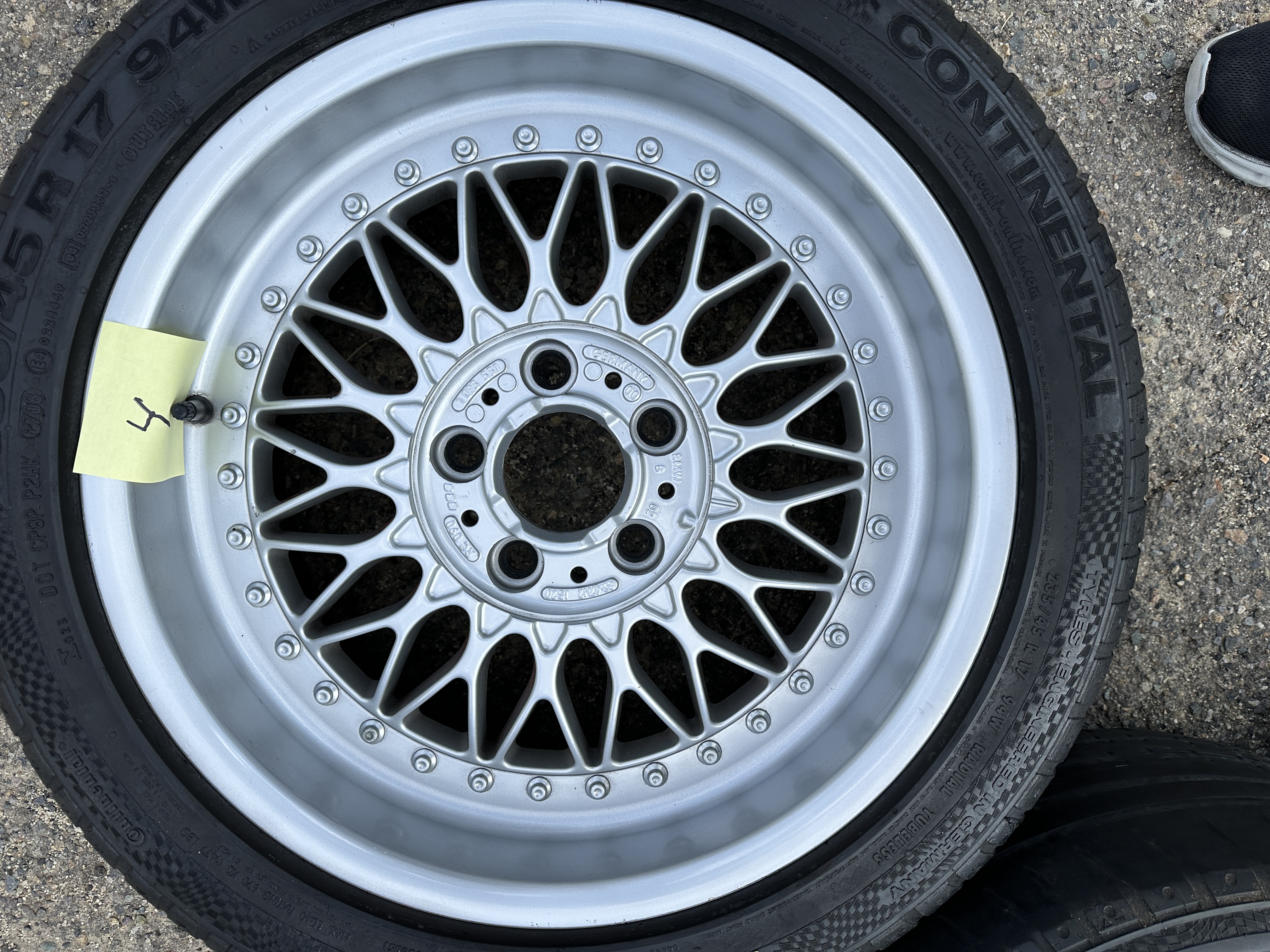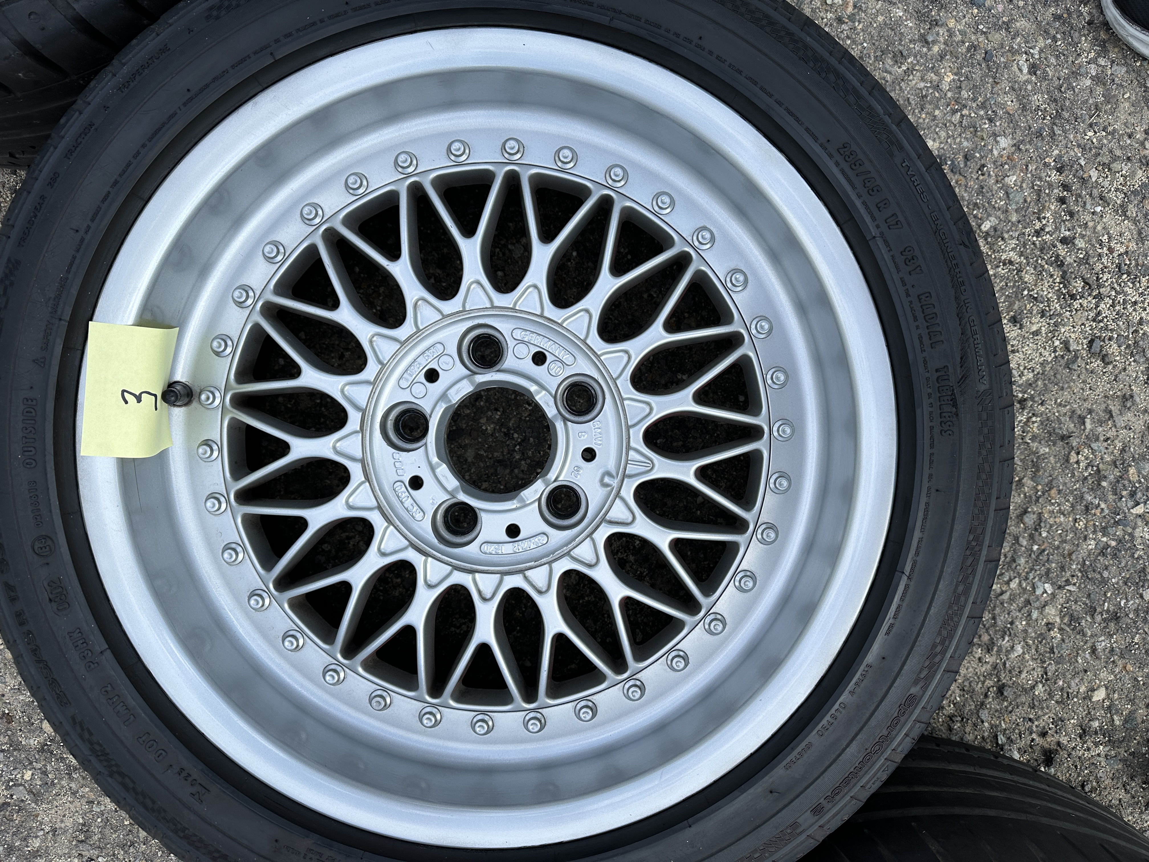 BBS wheels made for BMW in the Style 5 multi piece wheels 8" by 17" with an ET of 20 offset. Wheels in very good condition with only slight imperfections. Tires have aged out and are only for safe guarding the wheels. See photos for condition.