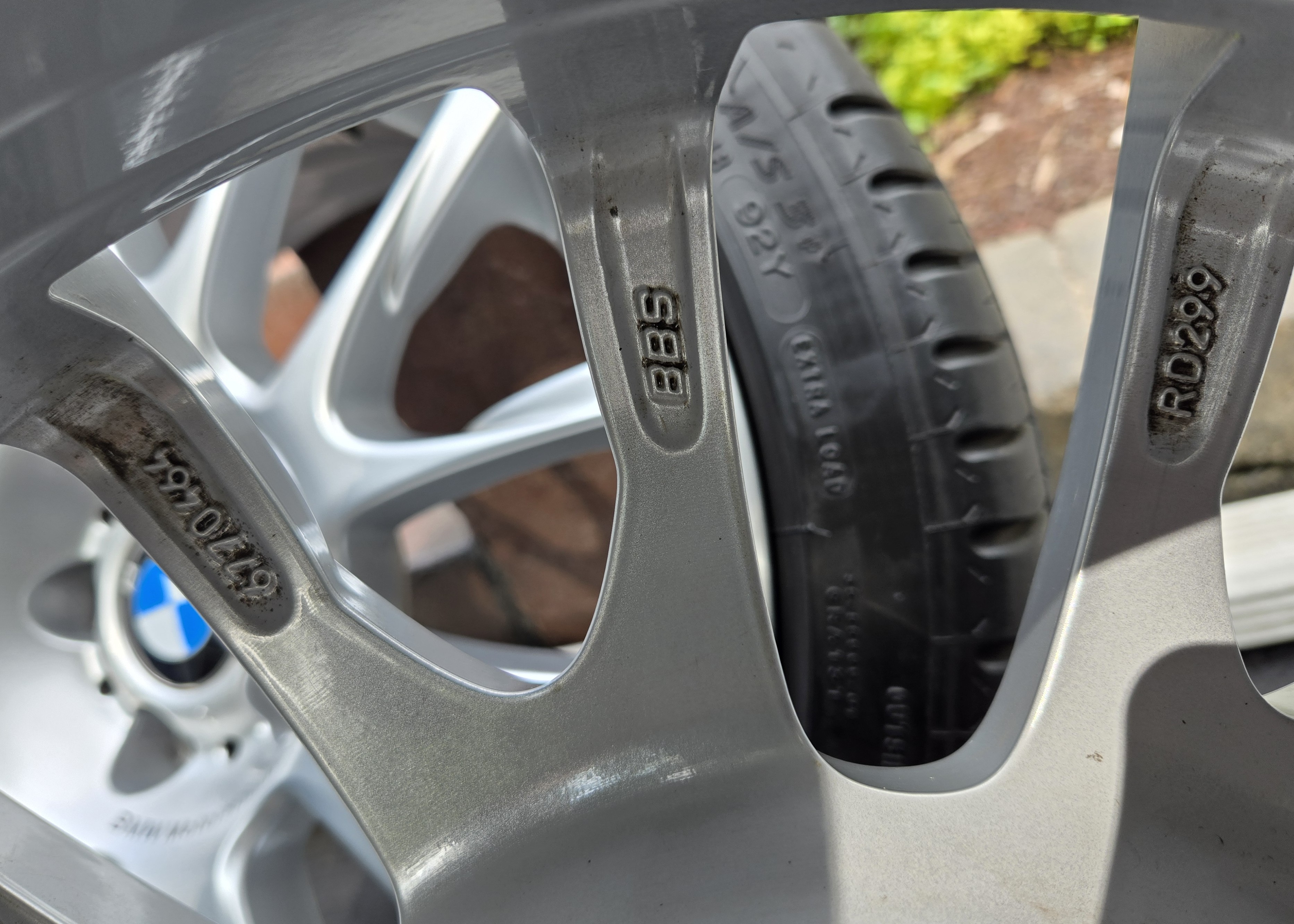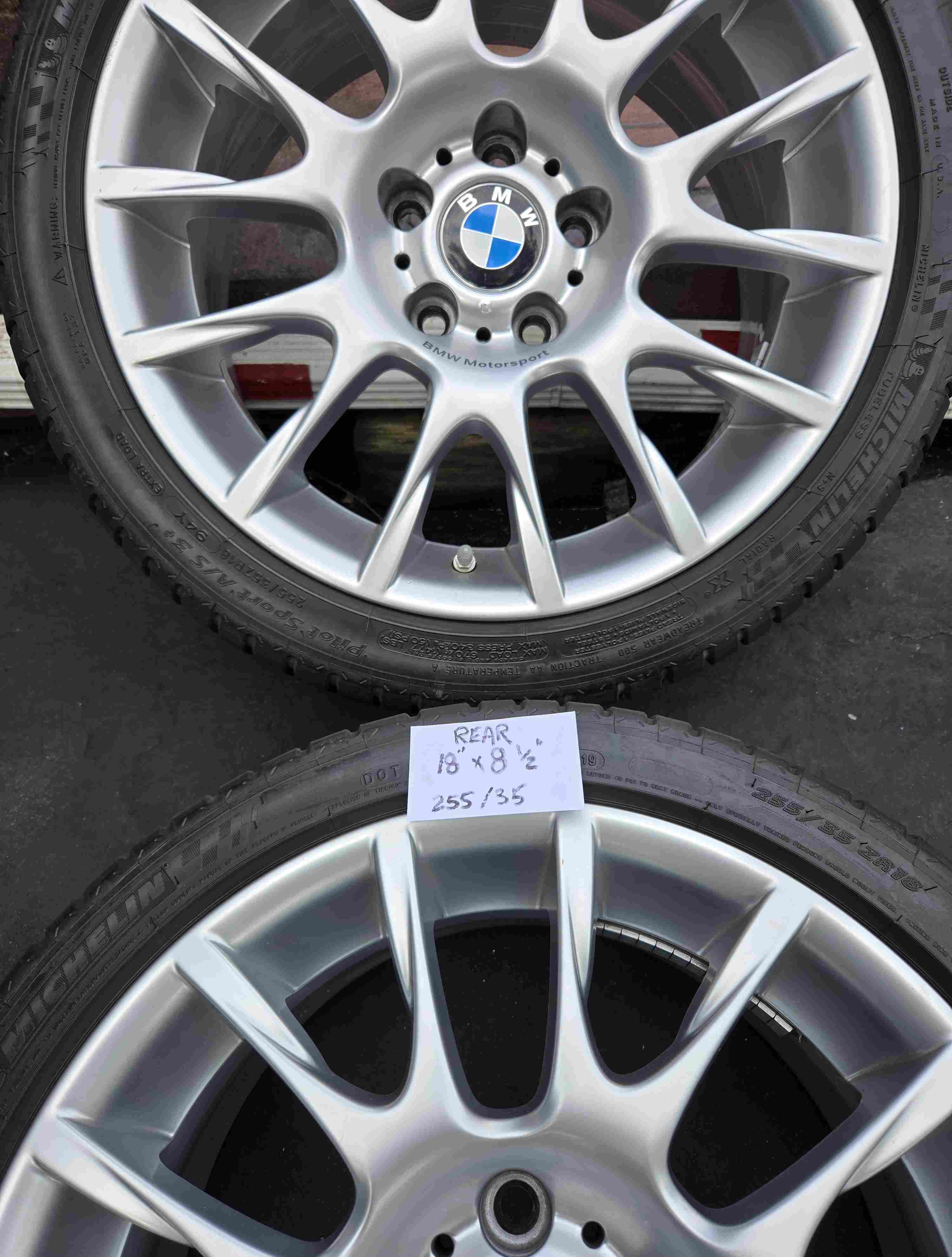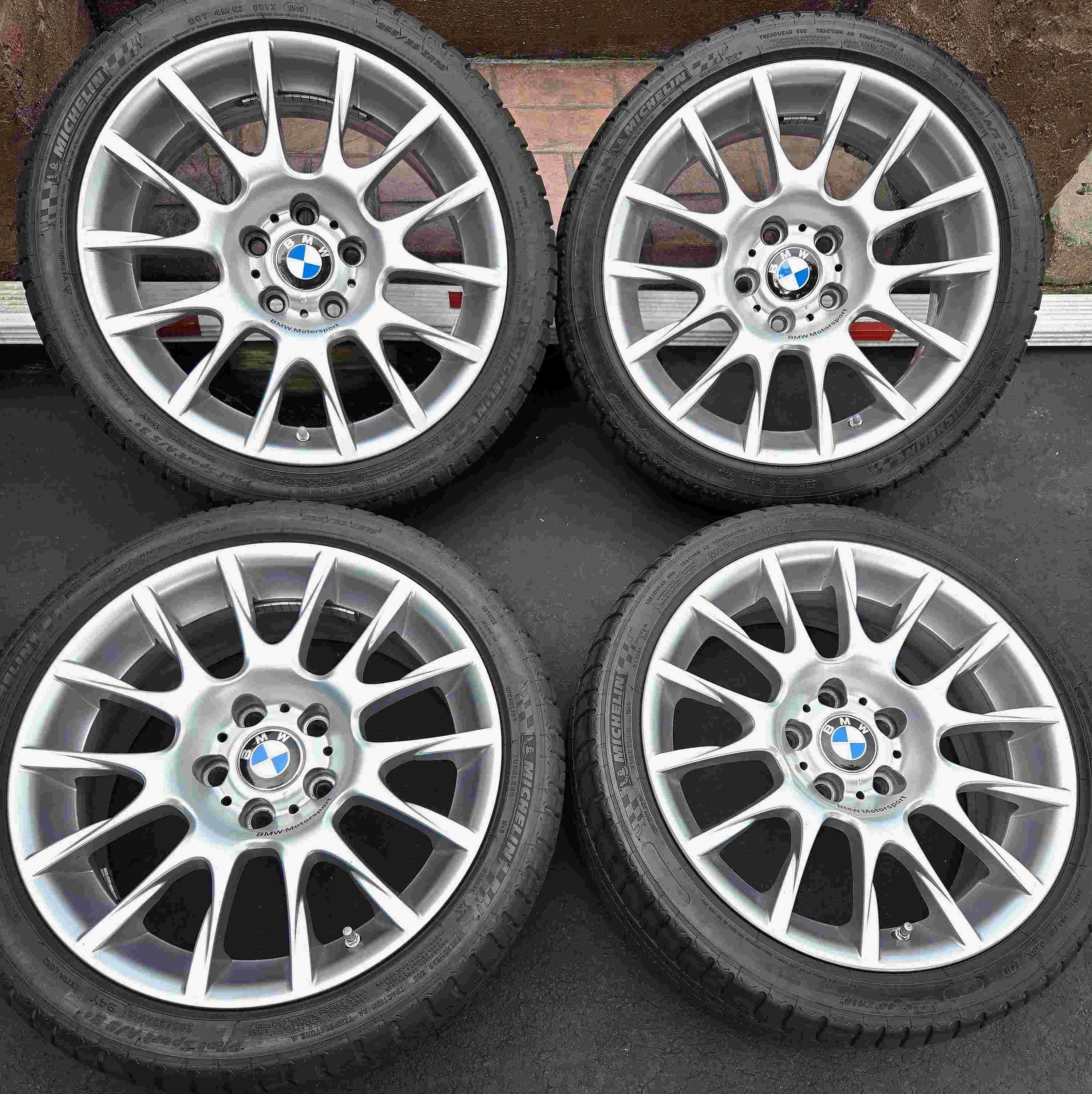 Front wheels: 18" x 8" (BBS logo) with Michelin Sport A/S 3+ 225/40-18 tires. (31/64" tread). Rear wheels: 18" x 8.5" with Michelin Sport A/S 3+ 255/35-18 tires. (15/64" tread). 2019 date code. Wheels are in perfect condition with no scuffs or bends. BMW Motorsport logo on all wheels and BMW center caps.