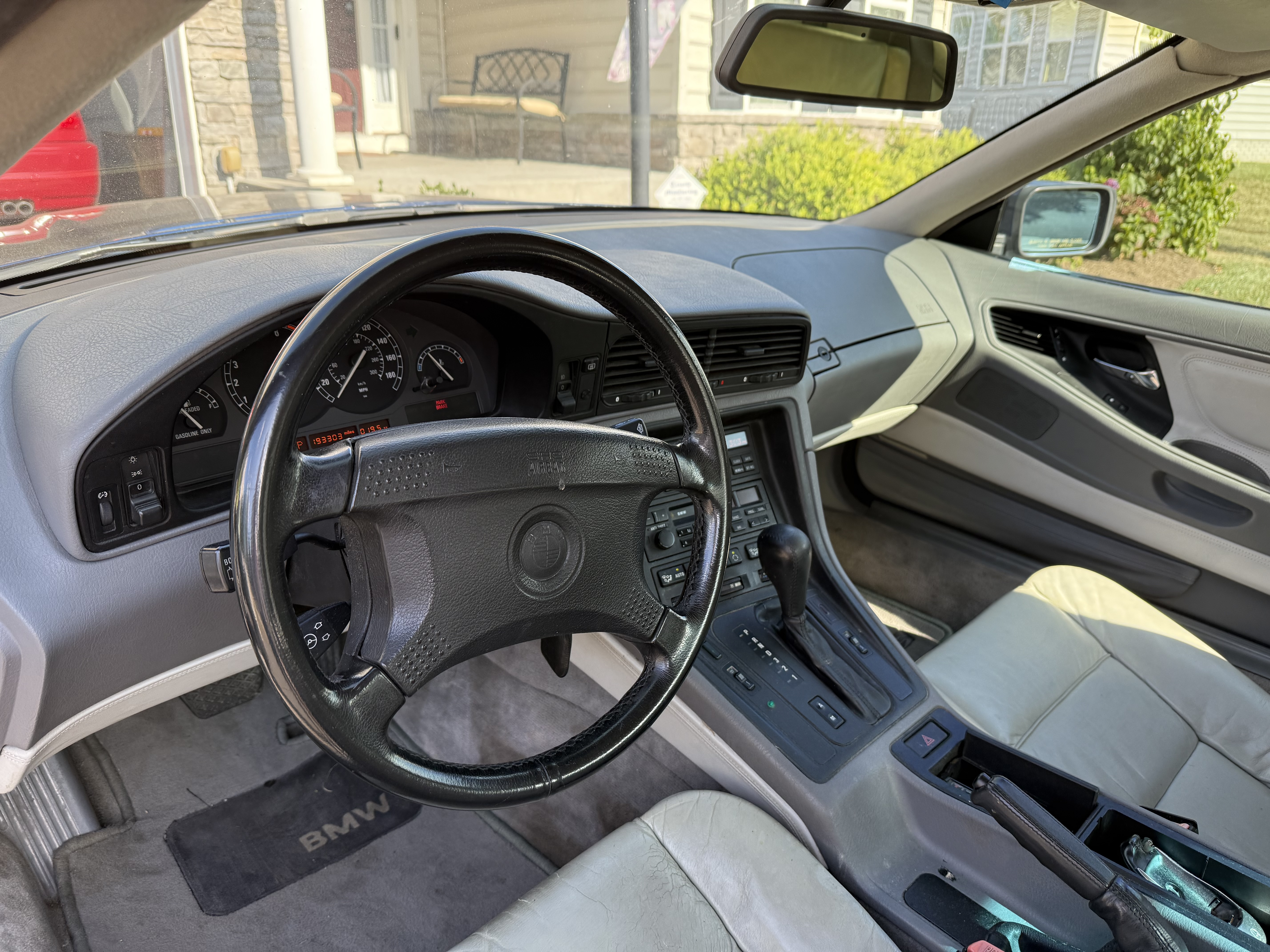 The 1993 BMW 850Ci is a high-end, 2-door luxury grand touring coupe from the E31 generation, known for its distinctive styling and V12 engine, paired with either a 4-speed automatic or a 6-speed manual transmission. It features a smooth, powerful driving experience with a driver-focused interior, safety equipment like airbags and ABS, and novel touches such as a reverse-tilting side mirror and pop-up headlamps. Also note that in 1993, the 850i was renamed the 850Ci, and a specific "c" for coupe was added to the badging to distinguish it from the 840Ci model that was also introduced that year.
