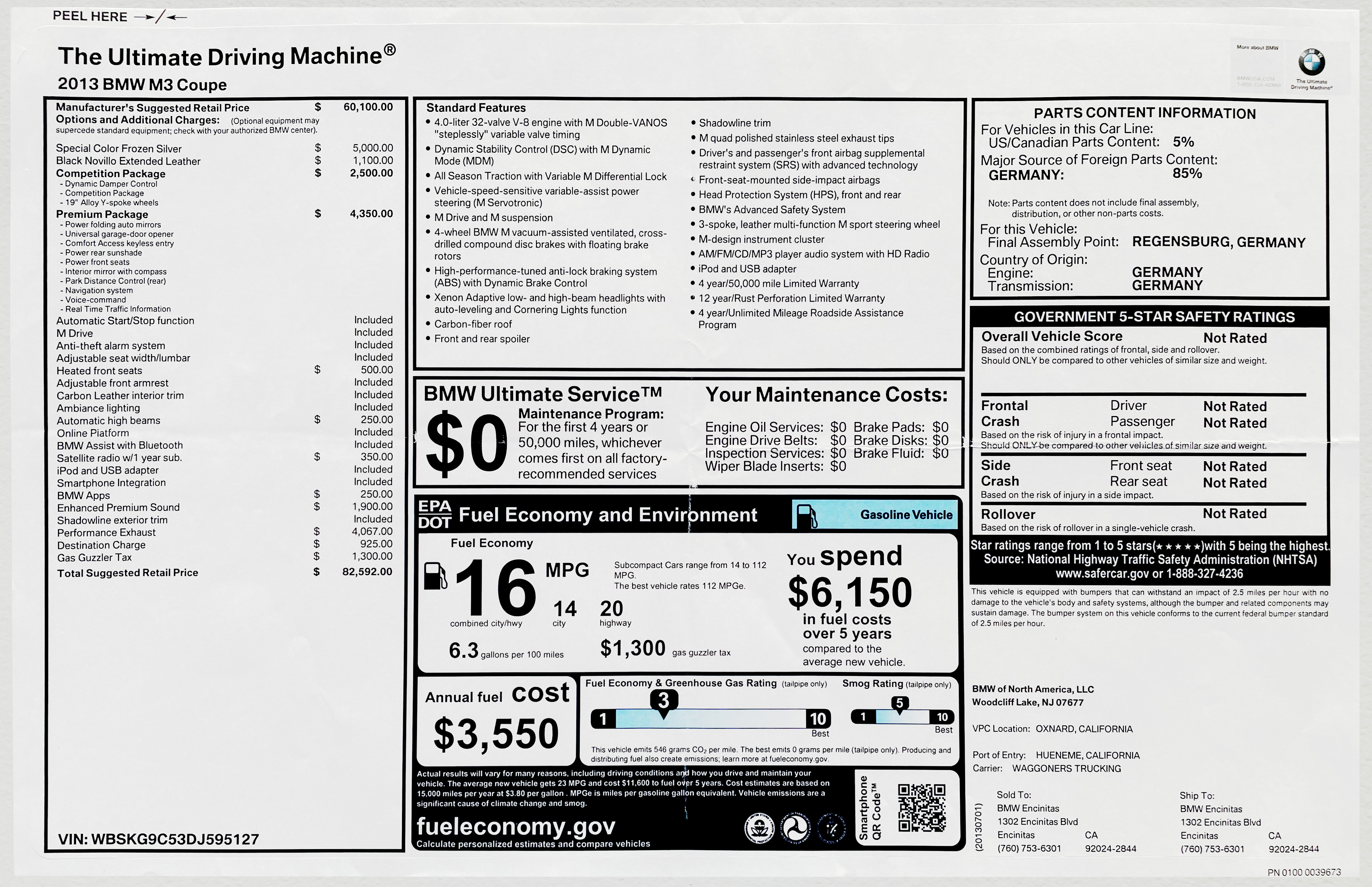 The last of the M3 coupes – built in May 2013. Special M Individual order by current, original owner. 16,835 miles – all original - always garaged - always properly brought to operating temperature. Frozen Silver exterior honoring the 1939 328 Mille Miglia Touring Coupe, with Carbon Fiber roof over Black Novillo Extended Leather interior and Carbon Leather interior trim. The last naturally aspirated, hydraulic steering M model, with 6 speed manual transmission, optioned with Competition and Premium packages, heated front seats, automatic high beams, satellite radio, BMW apps, Enhanced Premium Sound, Shadowline Exterior Trim, and M Performance Exhaust. Full Front Matte XPel paint protection film. Meticulously maintained by 30-year BMWCCA member and BMW Technicians. New OEM Pirelli PZero tires installed at 15,769 miles. All service records, CARFAX, manuals, original keys, sales brochures, window sticker, and various print magazines featuring the E92 M3 are included.