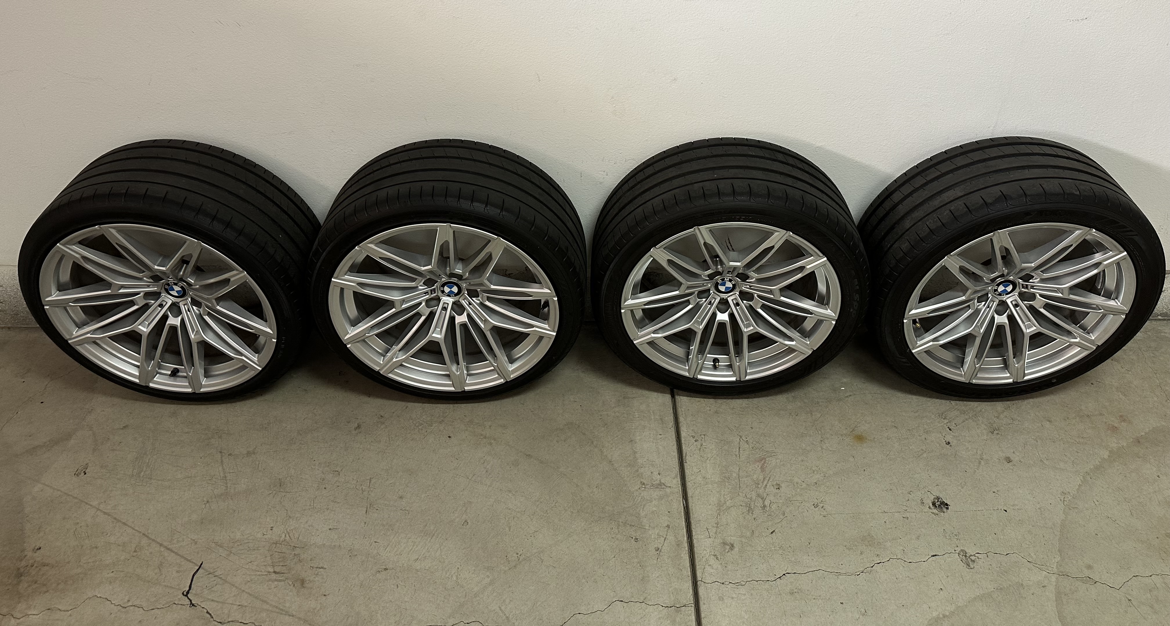 Like new factory BMW G87 M2 wheels and tires removed from an August 2025 M2 delivery. The vehicle received a new set of aftermarket wheels and tires, this package was removed promptly at approximately 965 miles. Wheel style is 930 M and the color is refined silver. Tires are Yokohama sport V107 “star” rated tires.