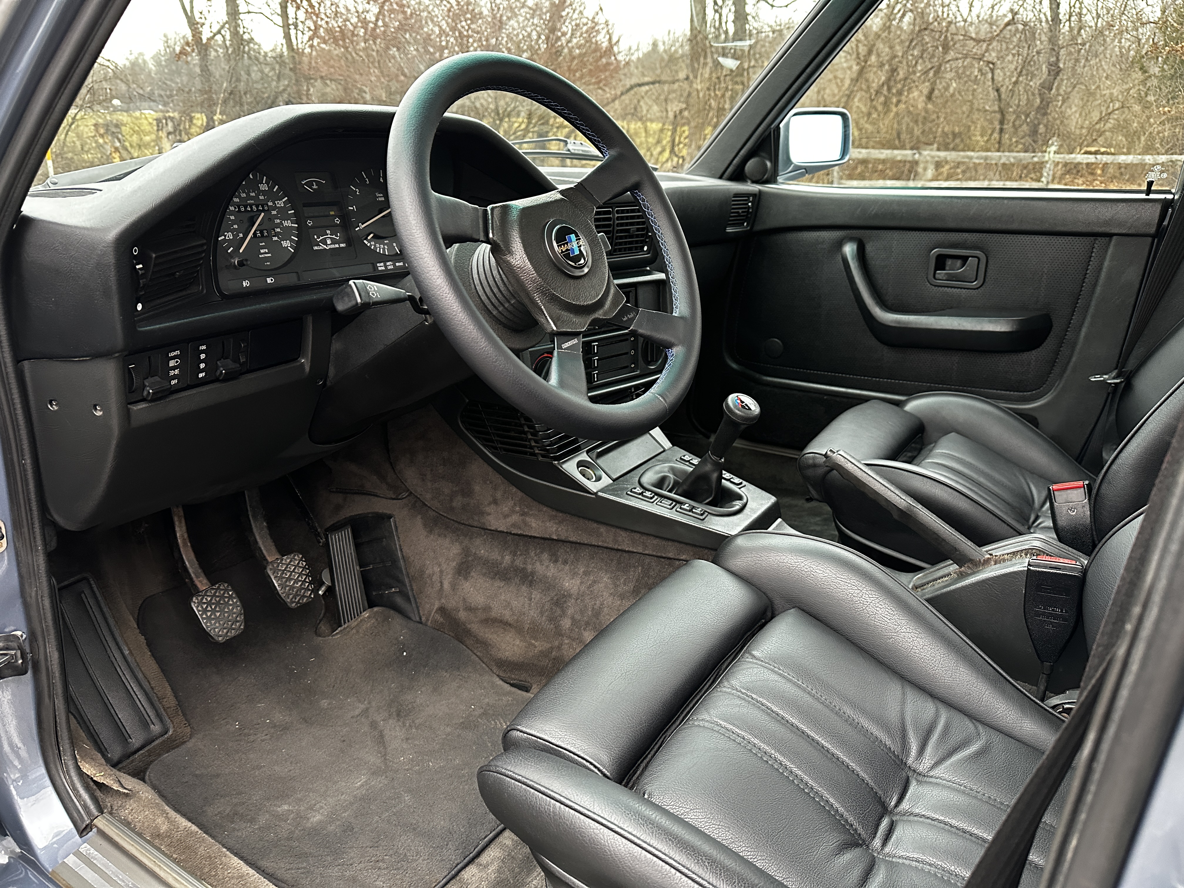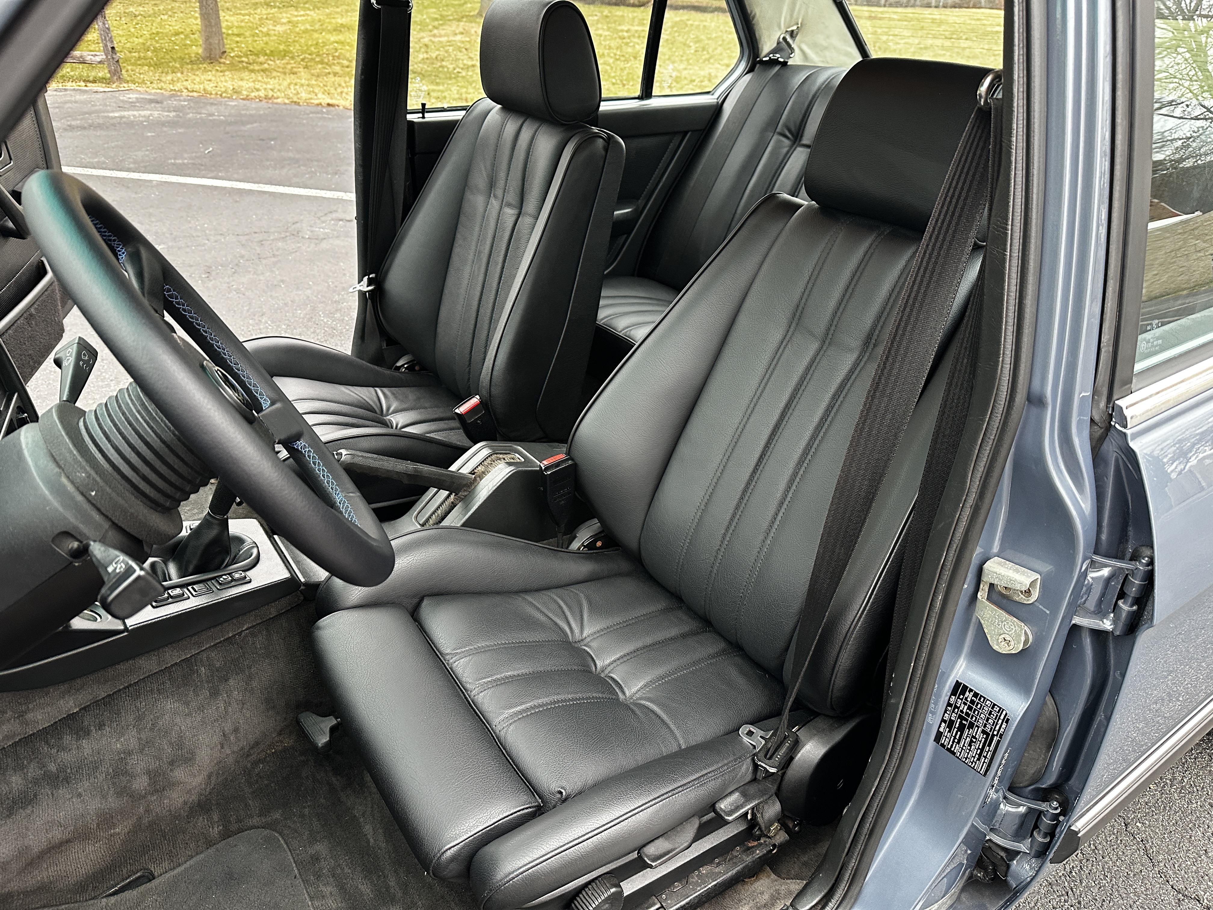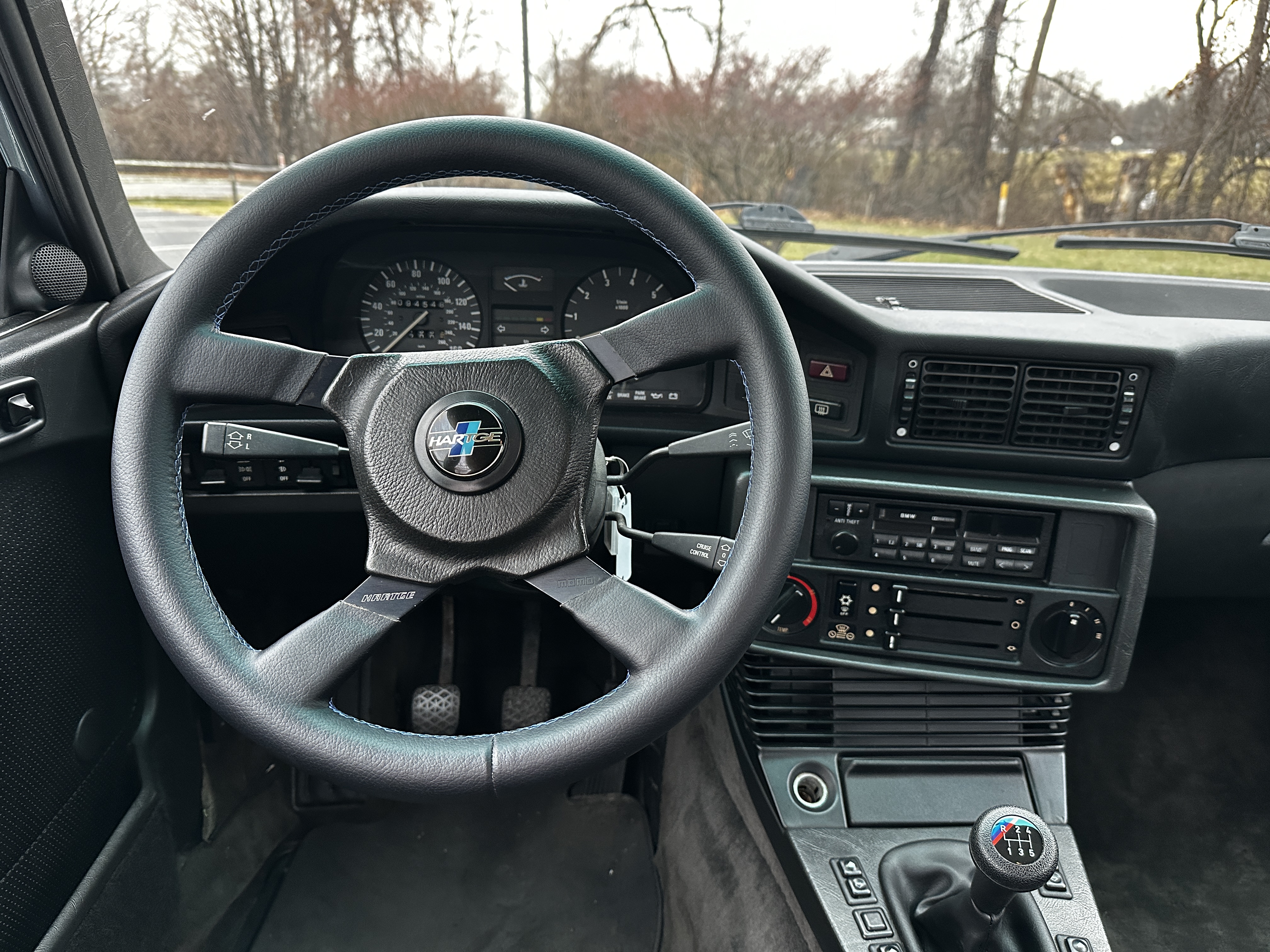 The interior is a standout feature and a genuine time capsule, blending originality with rare new old stock components. Finished in OEM BMW black leather, the cabin reflects the high standards of this build. The rare manual sport front seats and rear seats were professionally recovered by Gary Macher of Newtown, Pennsylvania, a highly respected craftsman whose work appeared at Pebble Beach and other concours-level events. The car is also equipped with a refinished period-correct MOMO wheel with a rare Hartge center.