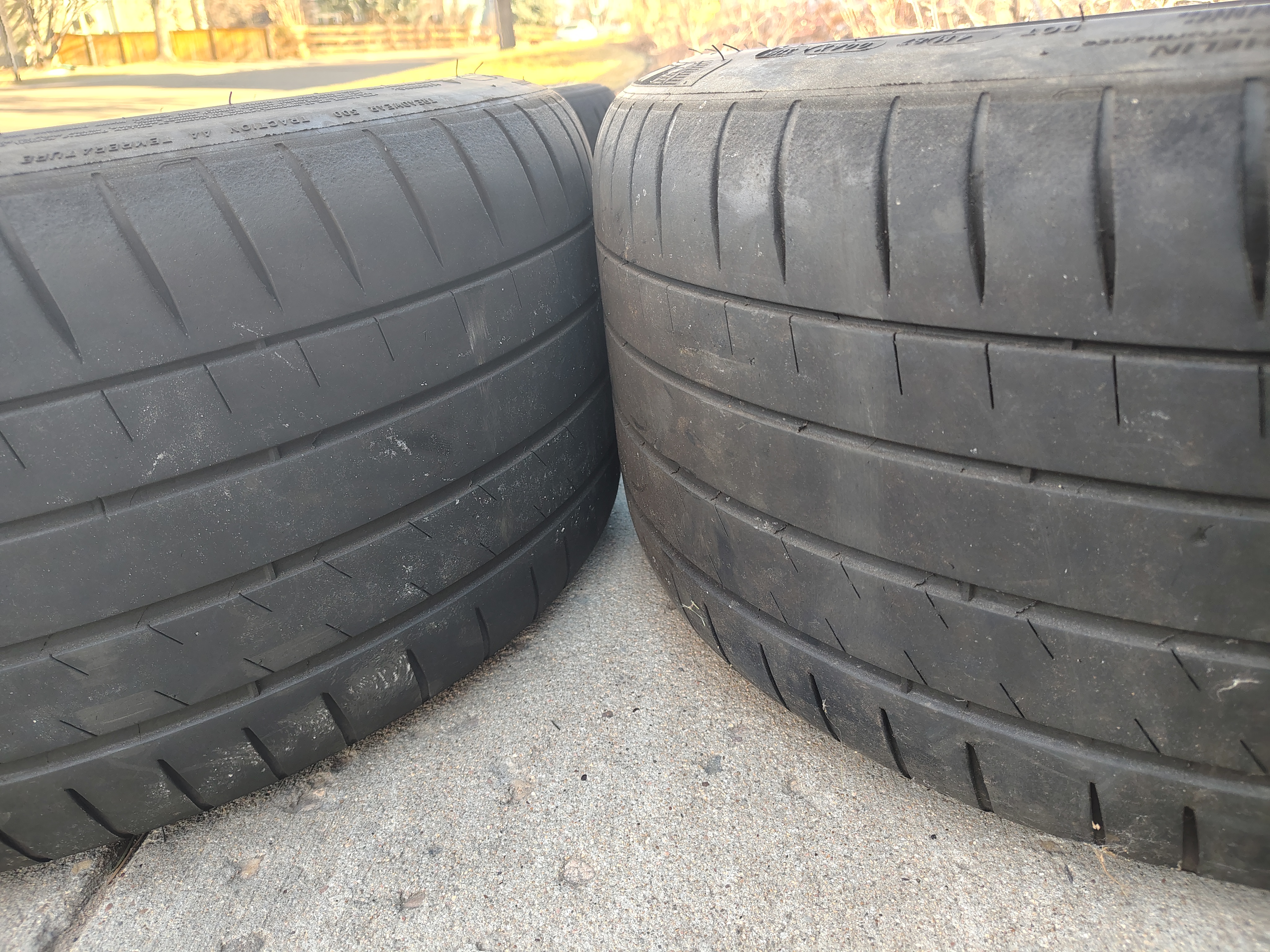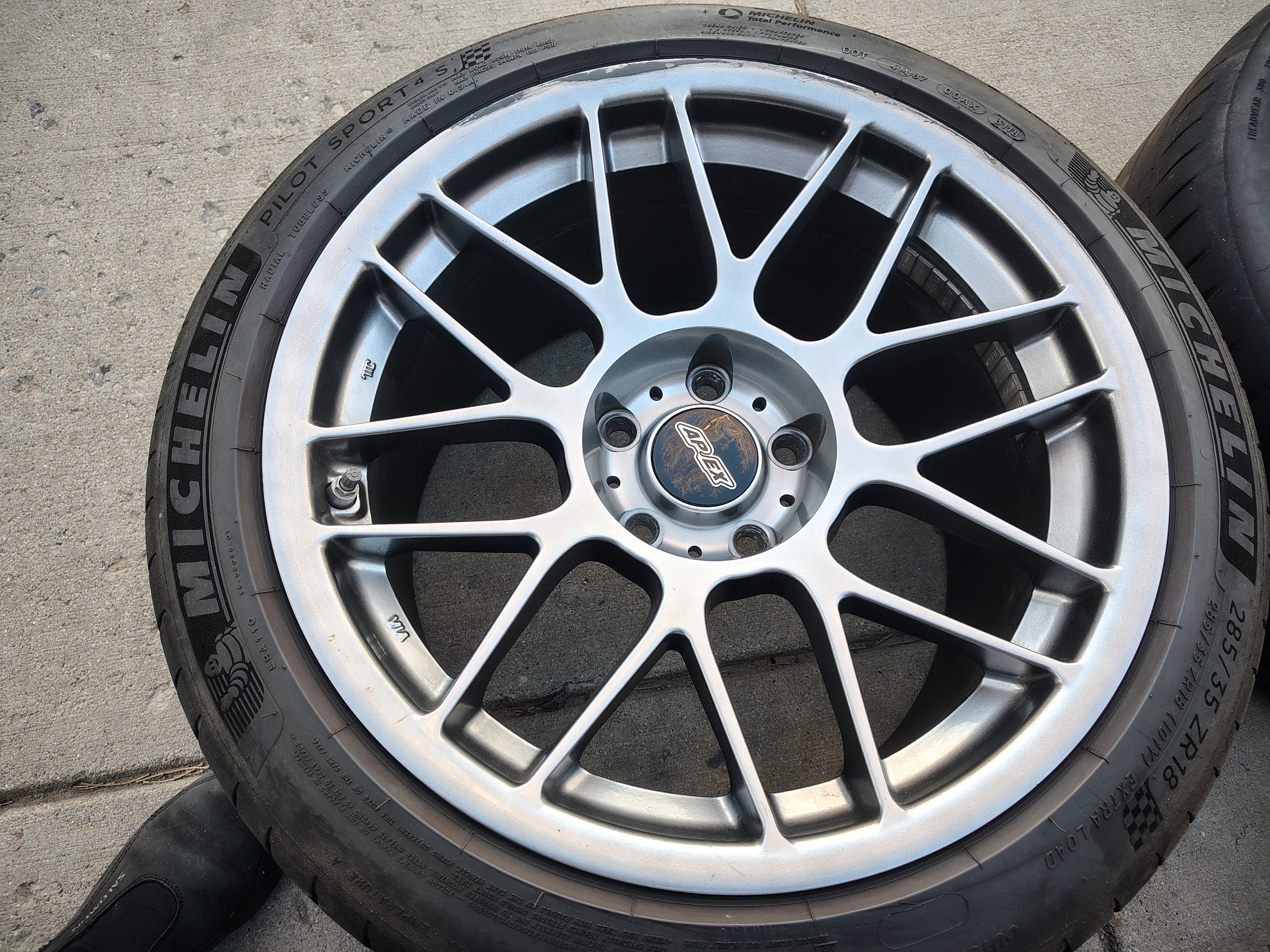 Track wheelset and good summer tires. Set $3000 new. 3.5-5mm remaining thread depth. . 265/35x18 ZR and 285/35x18 ZR withe 9" and 10" wheels. Anthracite color. Skuff-cosmetic damage on 2 rims/tires from curb after freak snow storm, shown in individual tire pics.. No functional damage. Stored off floor in garage most of the year. Used on my E90M3.