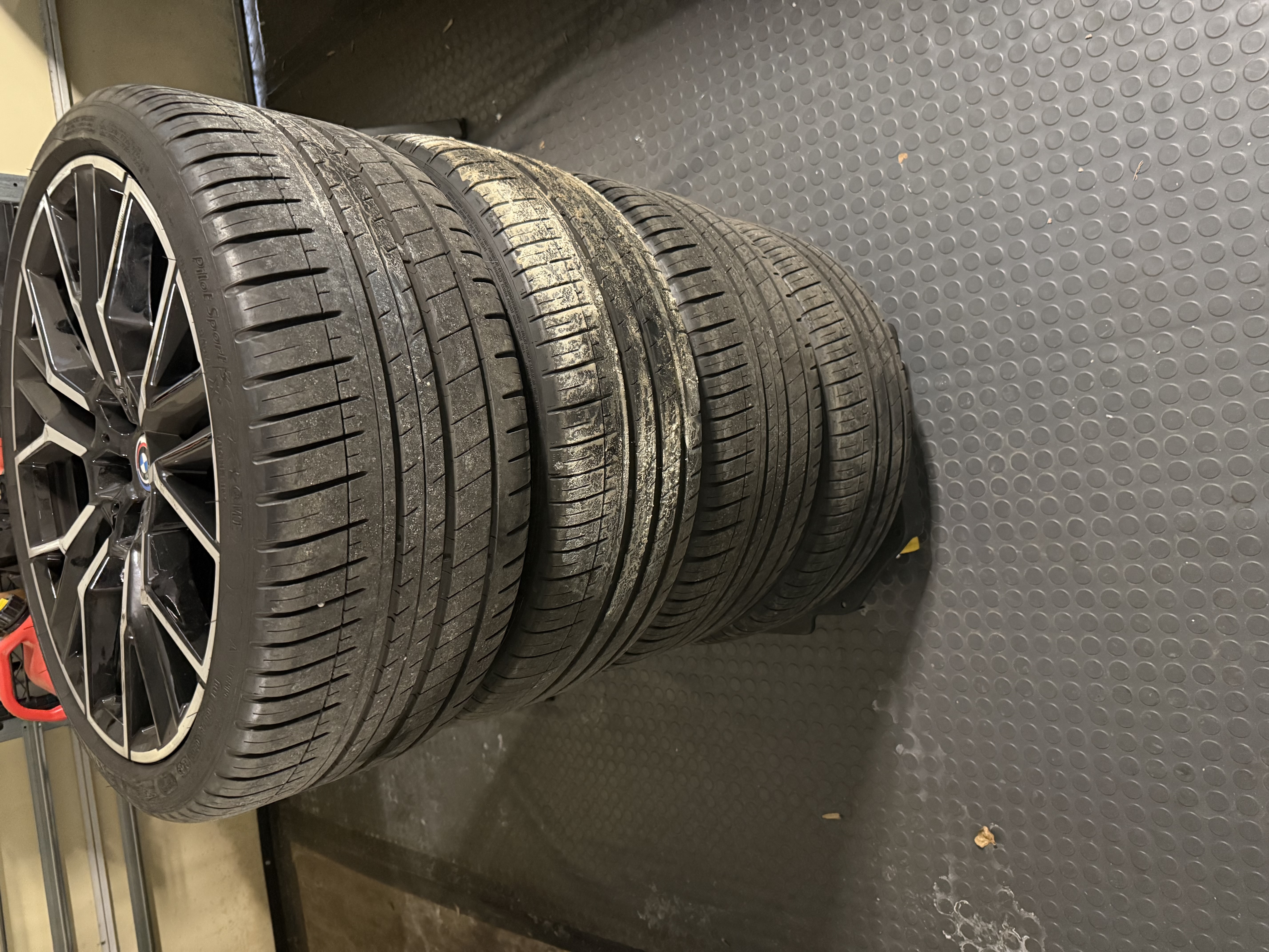 As shown. Stock M wheels for 2023 M850i Gran Coupe. Two of the rims are less than 9 months old old, one original, one with small hairline crack repaired (welded). All balanced. Tires purchased August 2024 and have only 7,145 miles, plenty of tread. TPS included. Selling due to Upgraded to Vossen wheels and non run-flats. Cash or Zelle or cashiers check only. You pick up or pay shipping. Rims are $1200 new from BMW. Tire prices shown in pics. Total new would be over $6800.
