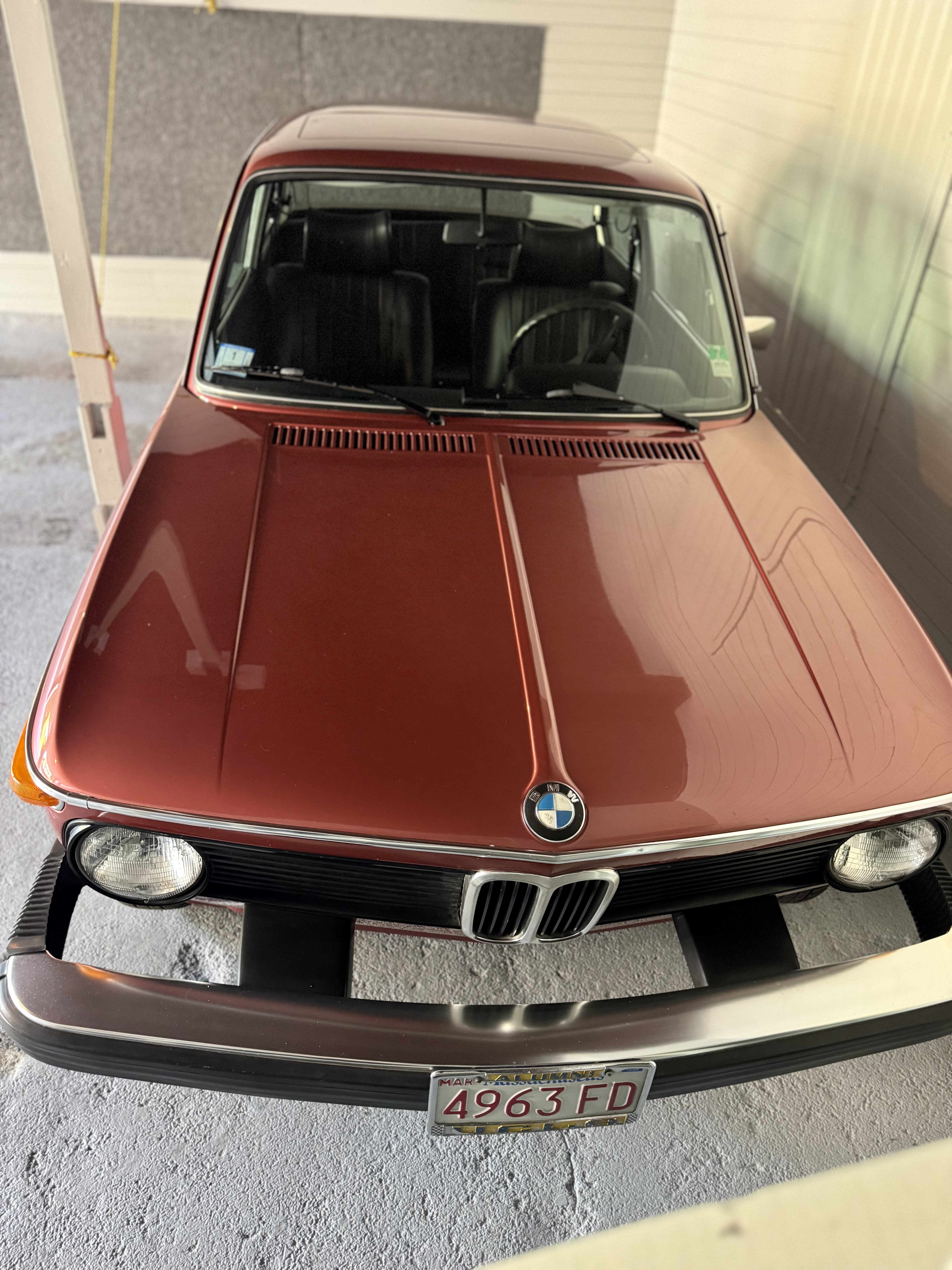 A pristine single owner 1976 BMW 2002 finished in the original Granatrot-Metallic with only 42,000 miles. It features a black vinyl interior and a 4-speed manual transmission. The seller purchased it new about 50 years ago when it was released, and he used it only for very short trips. Car is in perfect working order with no issues to note. Not a re-paint and it has no blemishes or rust. The vehicle has only been used for very short trips in good weather since its original purchase.