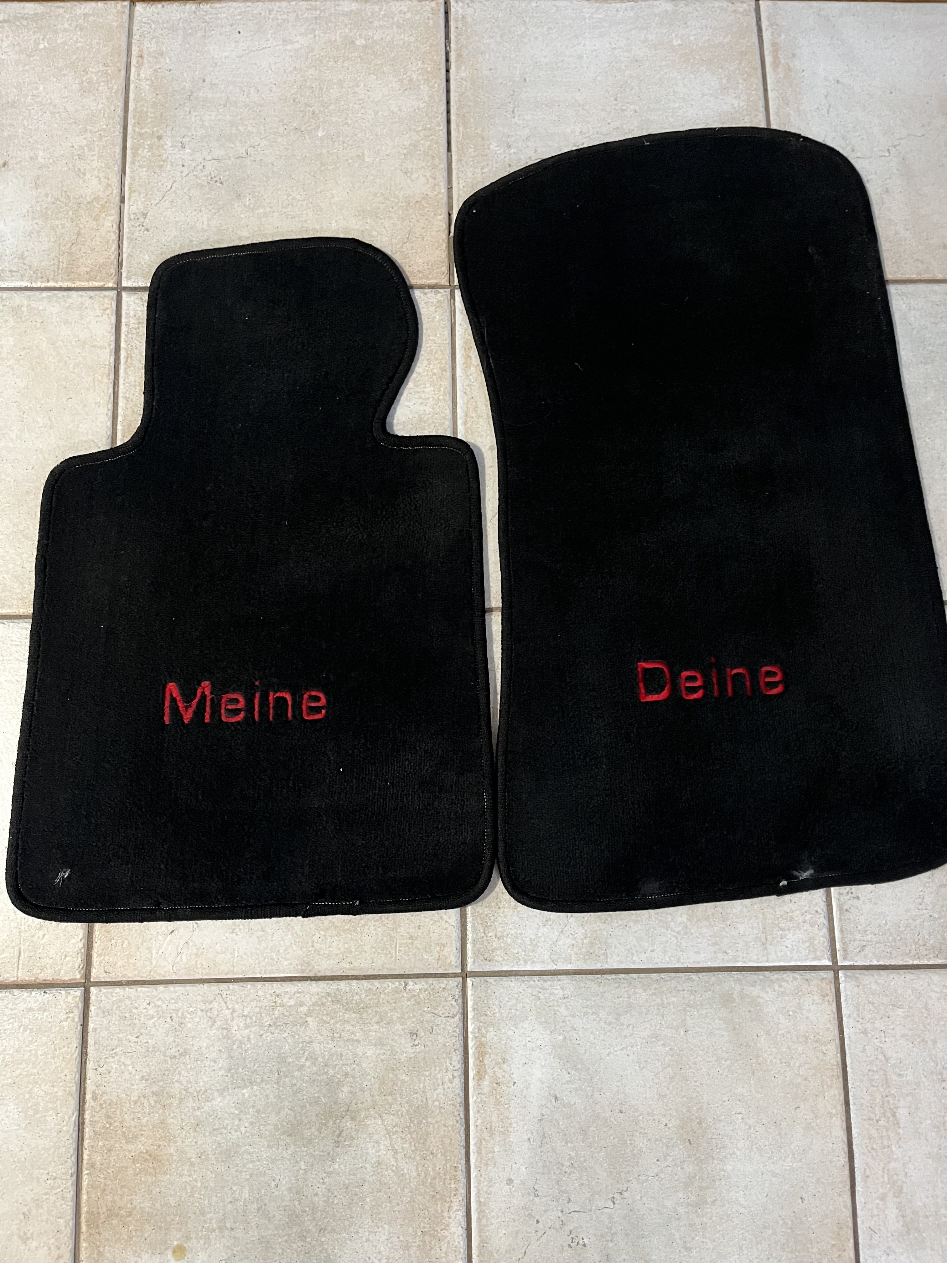 Custom carpet mats for E46 (325xi). Black mats with red lettering. Front mats embroidered with “Meine” driver side and “Deine” passenger side, which in informal German mean Mine and Yours, respectively. Mats are in good condition as I switch them out each season for winter mats. Mats include both front and rear.