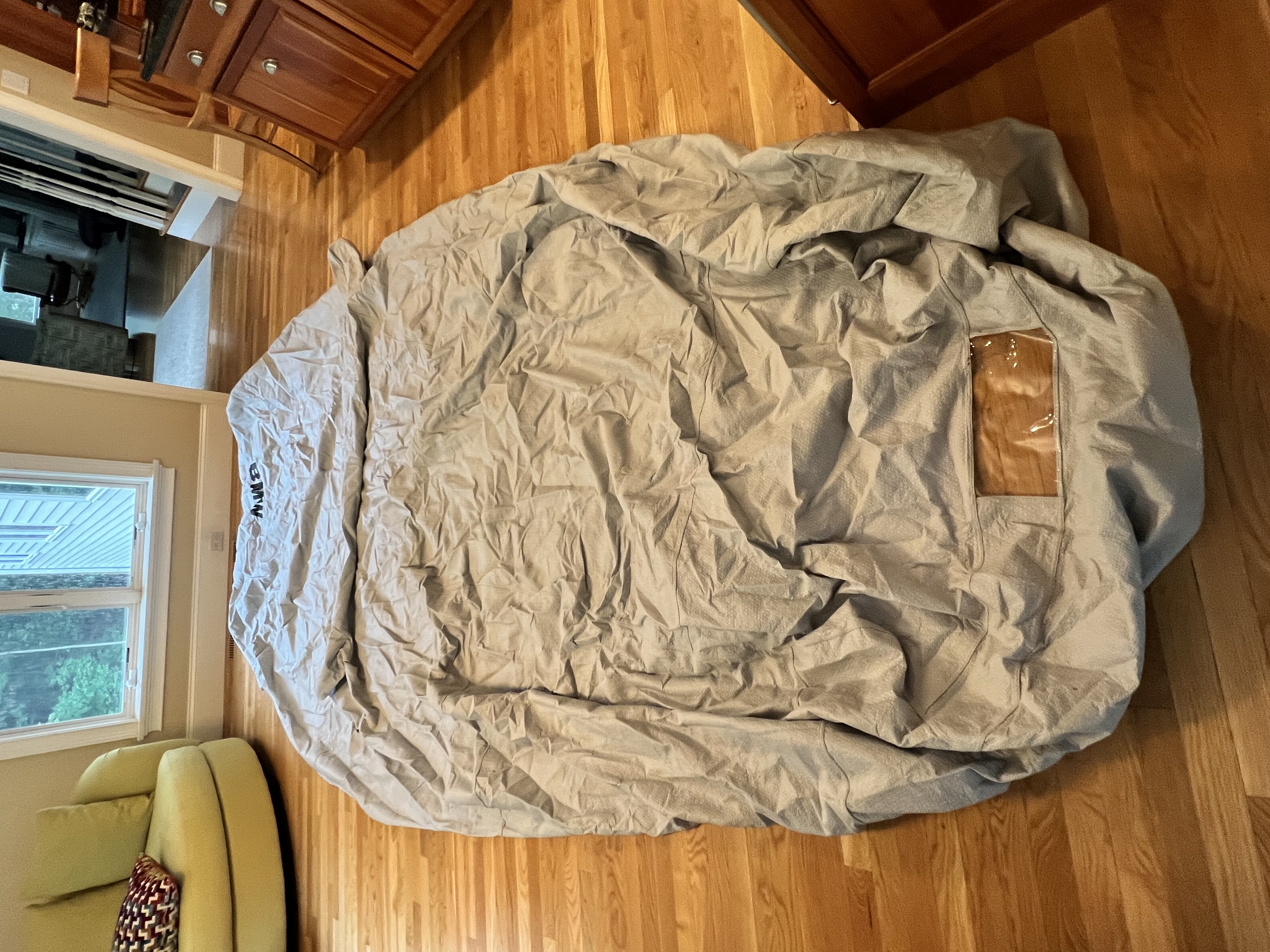E46 indoor car cover with mirror wings, rear license plate view, right & left side grommets and custom storage bag. Used only in my garage to minimize dust & prevent my kids from scratching the paint. Not perfect but in good condition.