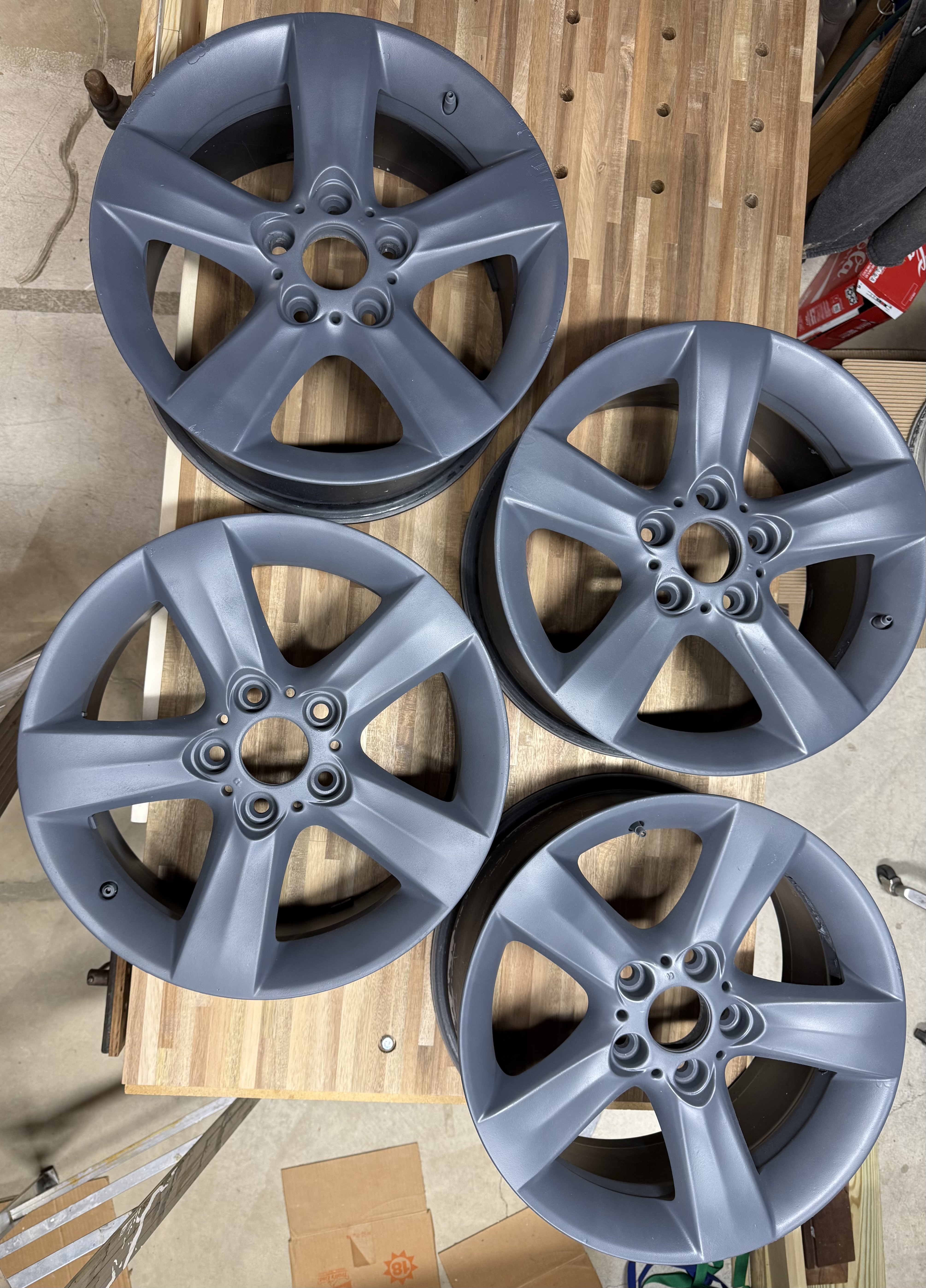 Genuine BMW rims. OEM Part #36116758987, Style 119. Bolt pattern 5x120mm, Size 8Jx17 H2, Offset IS47 [or ET47]. AlSi7Mg Aluminum Alloy (Light; High Strength; Corrosion Resistant). Made in Austria. For 3-Series and likely M3. Painted with Plasti-Dip rubber coating. Cash Only. Will ship at buyer’s cost.
