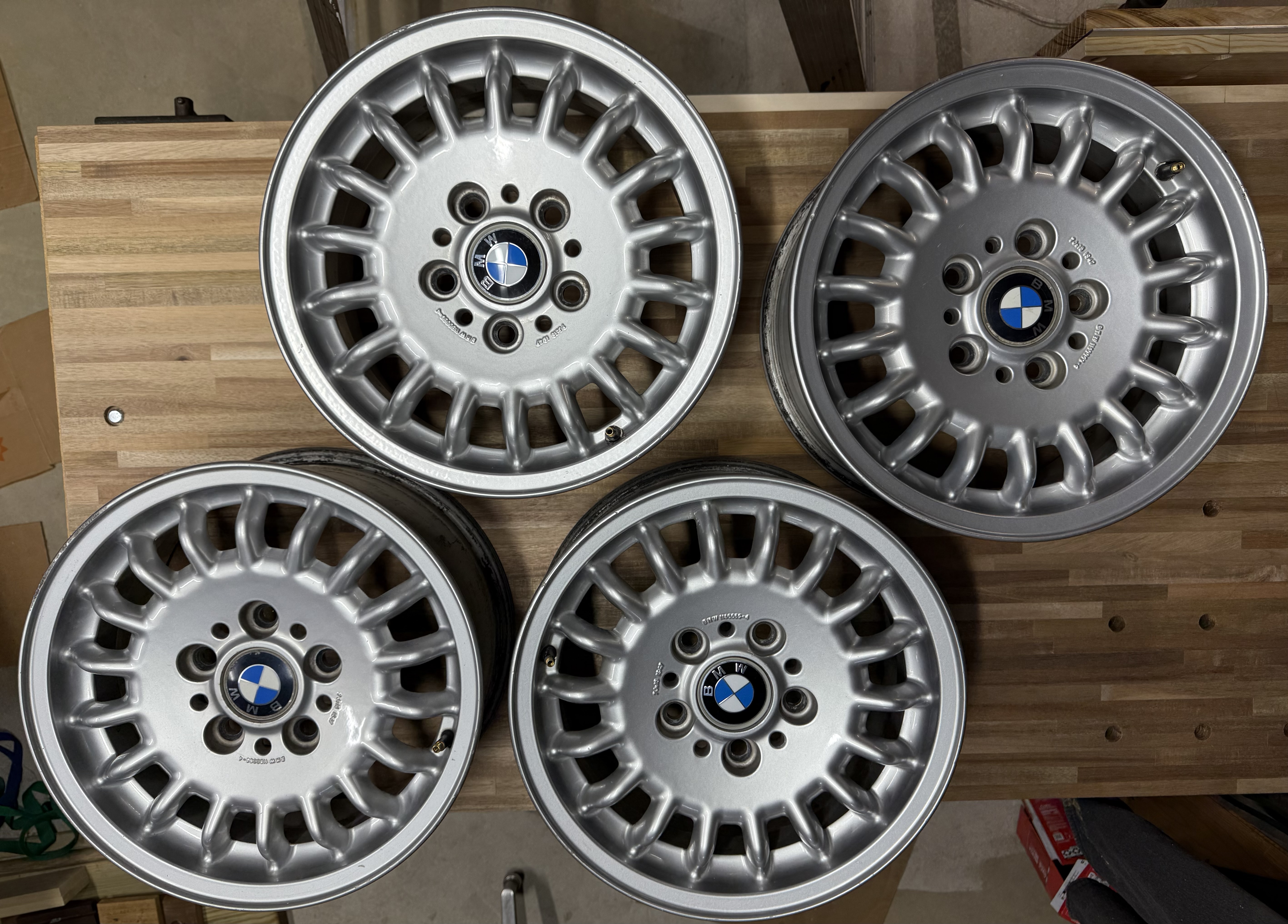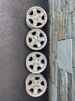 Set of 4, 7 in. x 15 in. OEM alloy wheels for E34 5 Series (1989 to 1996). Very good condition.