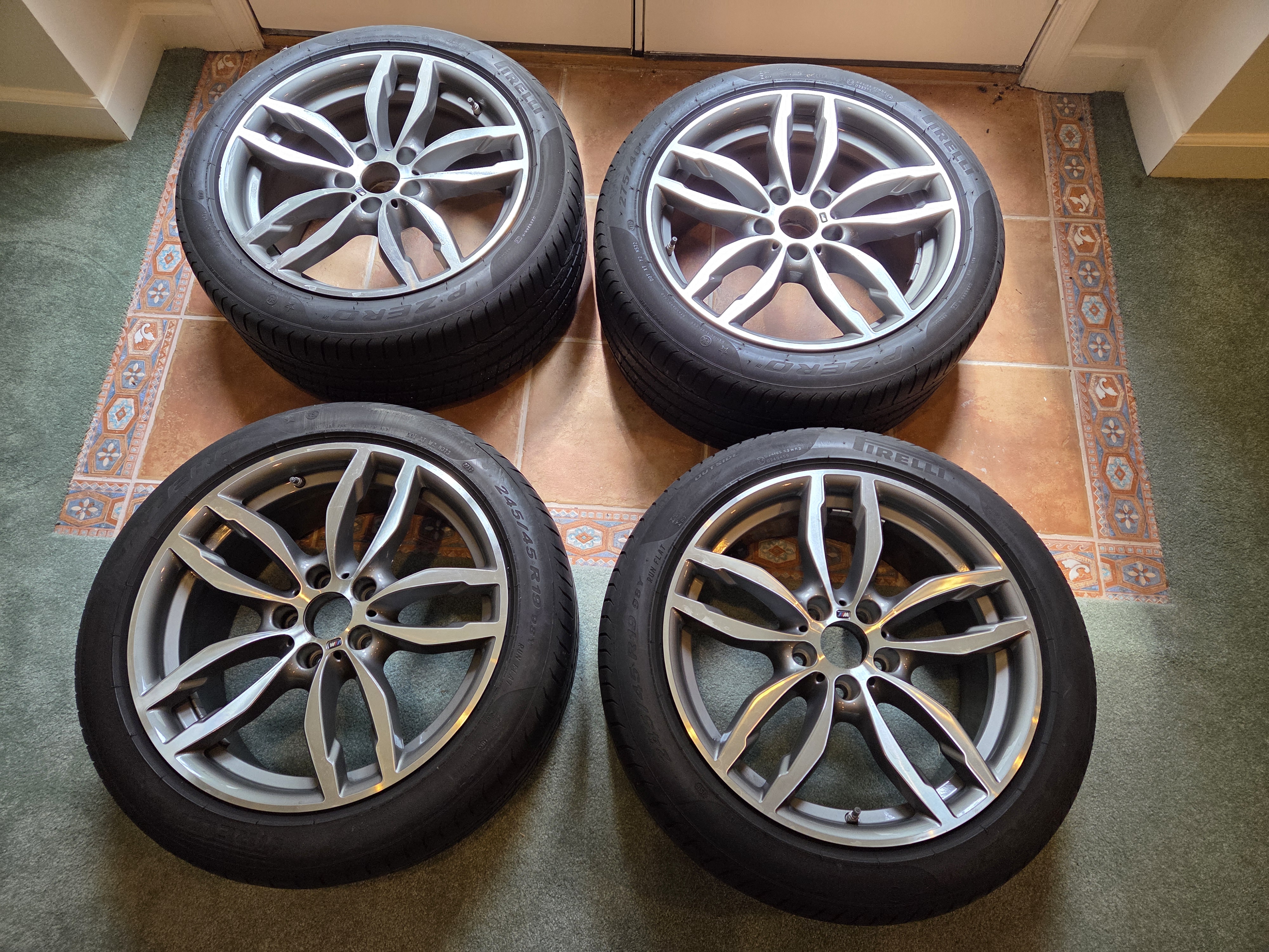 BMW OEM Bridgestone all season performance 275/35/r19 and 245/40/r19 RFT. Took off of BMW G30 M550. Staggered set. The tires are changed to non RFTs prior to taking delivery of car. 9/32 thread depth.