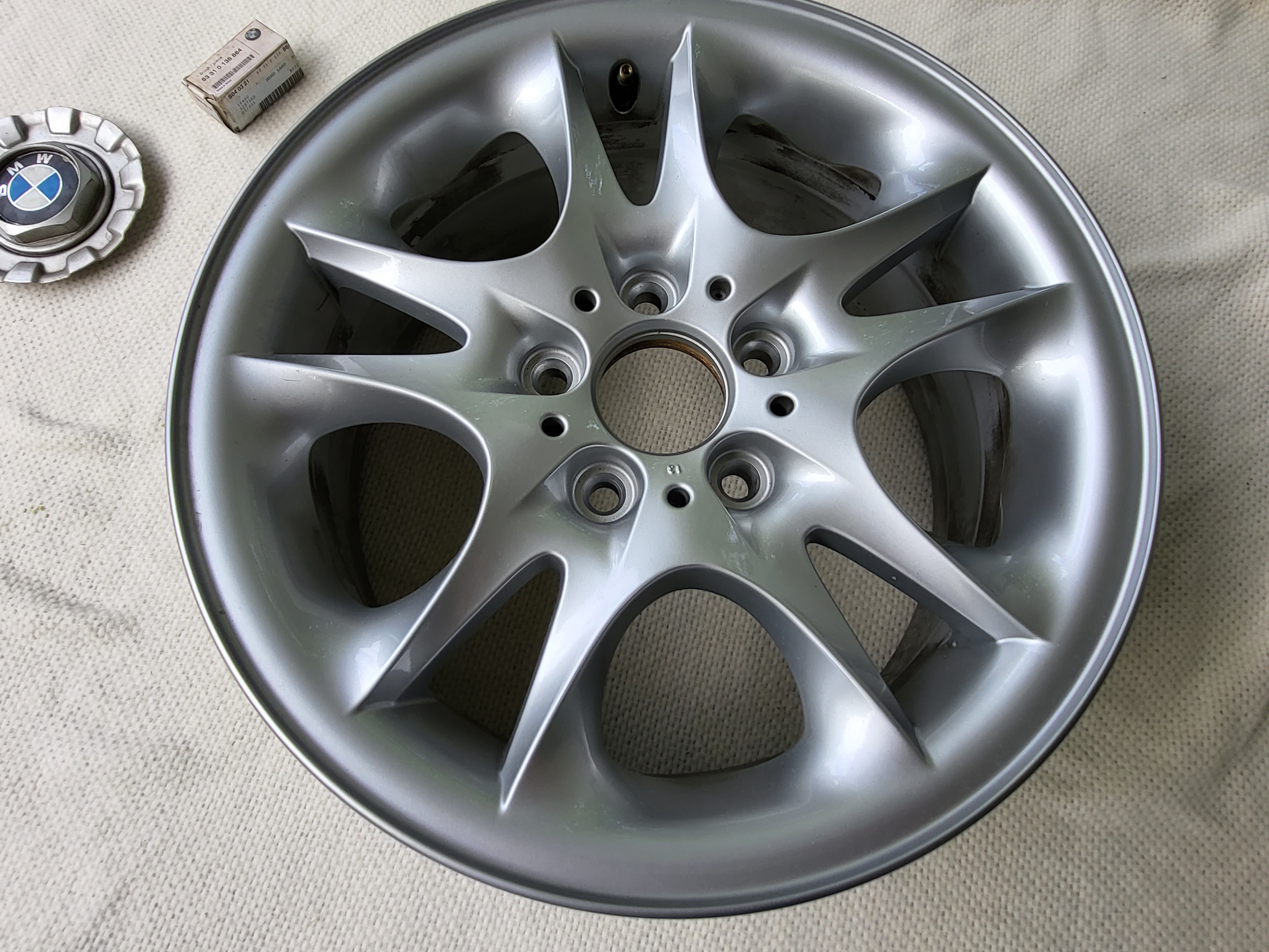 This is a very good condition E83 BMW X3 single wheel. No curb rash, or pothole dents. Perfect for replacing a damaged/ dented wheel, or full size spare.