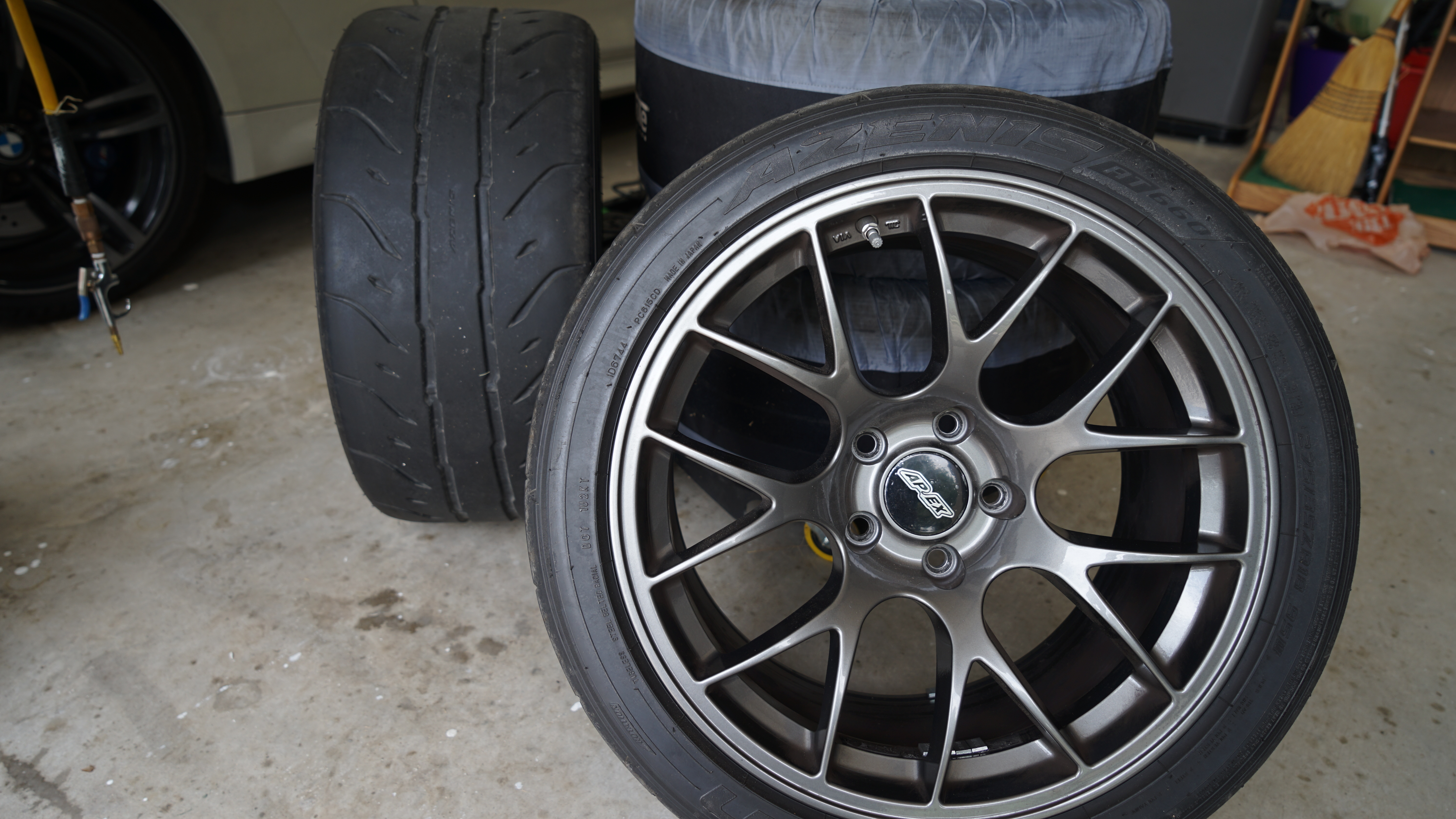 Selling a staggered set of 18" APEX SM-10 wheels in Anthracite with Falken Azenis RT660 tires mounted and OEM TMPS sensors installed. The front wheels are 18x9" ET30 and the rear are 18x10" ET25. The tires on all wheels are 285/30/18. Each wheel has an OEM BMW TPMS sensor installed as well.