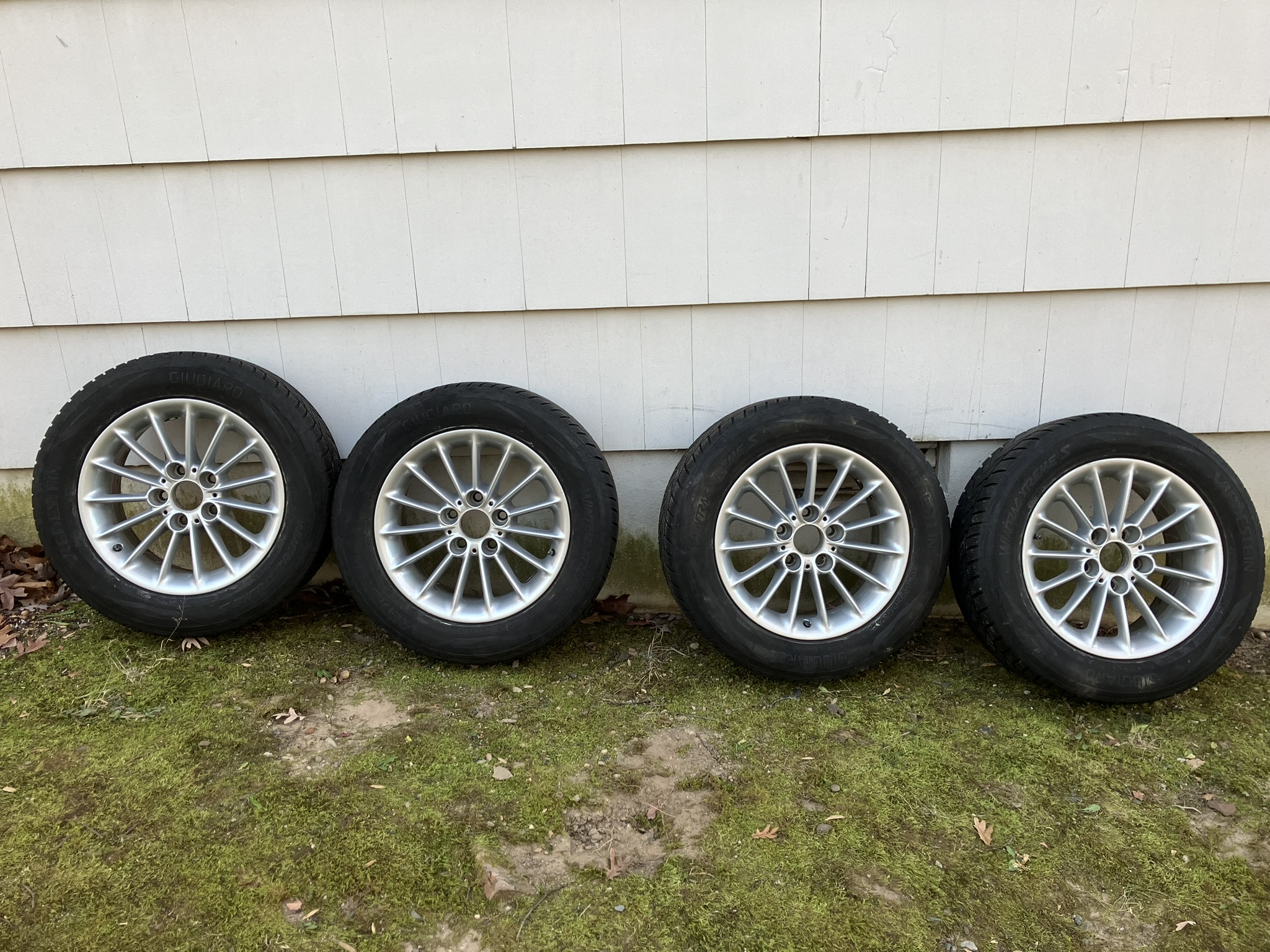 mounted on factory BMW wheels that have been used about 7,000 miles over 5 years of winter driving. Tires have been rotated front to back and have remaining tread depth of 8/32". Rims are in excellent condition with no curb rash. The manufacturer date of the tires on the sidewalls is 3018. These snow tires were used on my E39