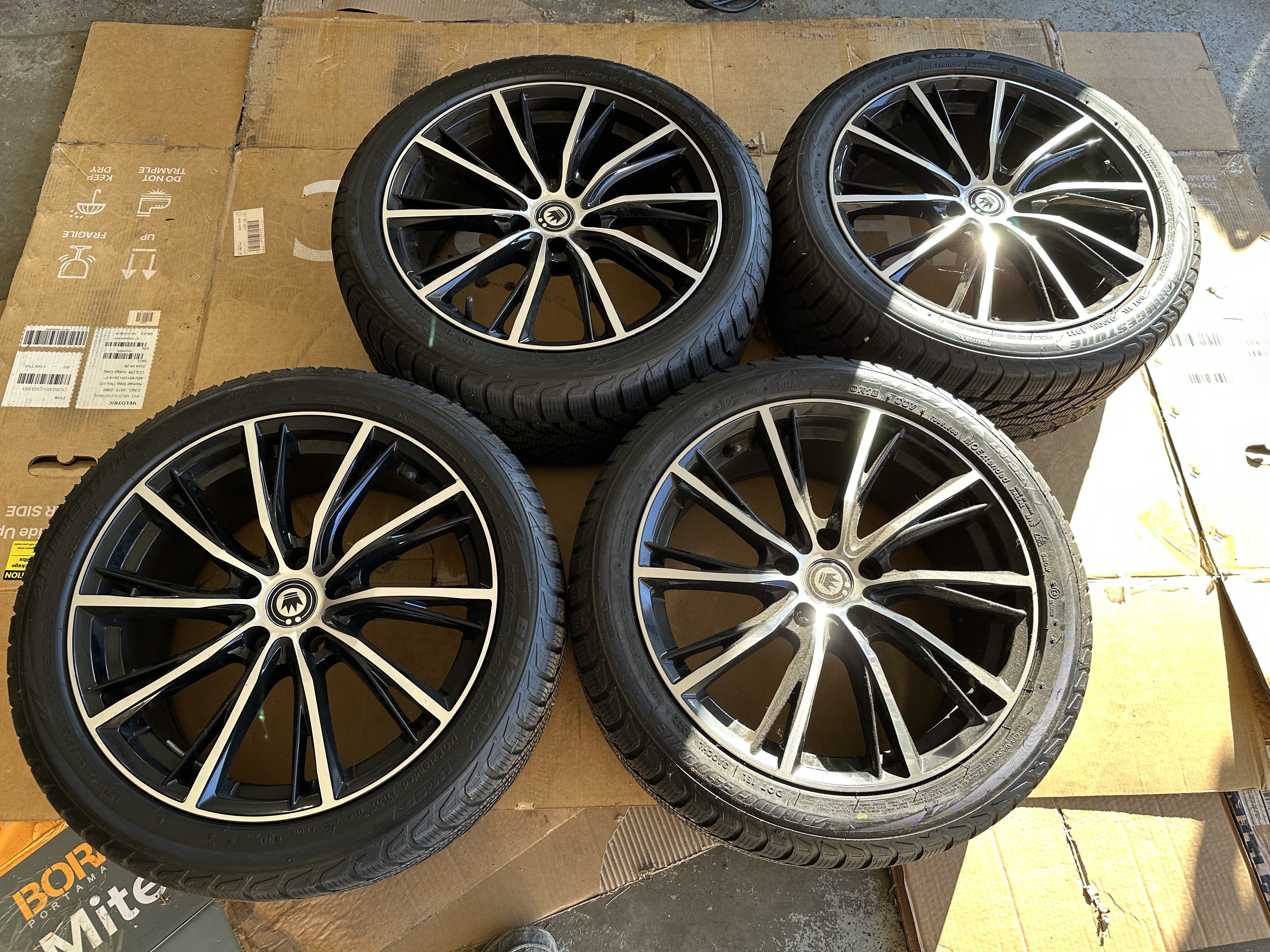 This is a set of 4 18x8 wheels with mounted, balanced & TPMS added Bridgestone Blizzak LM-32 tires size 255/40/R18. I had them on my 2022 z4 for one season, just under 3000 miles. A little dust on them from my garage but otherwise flawless.