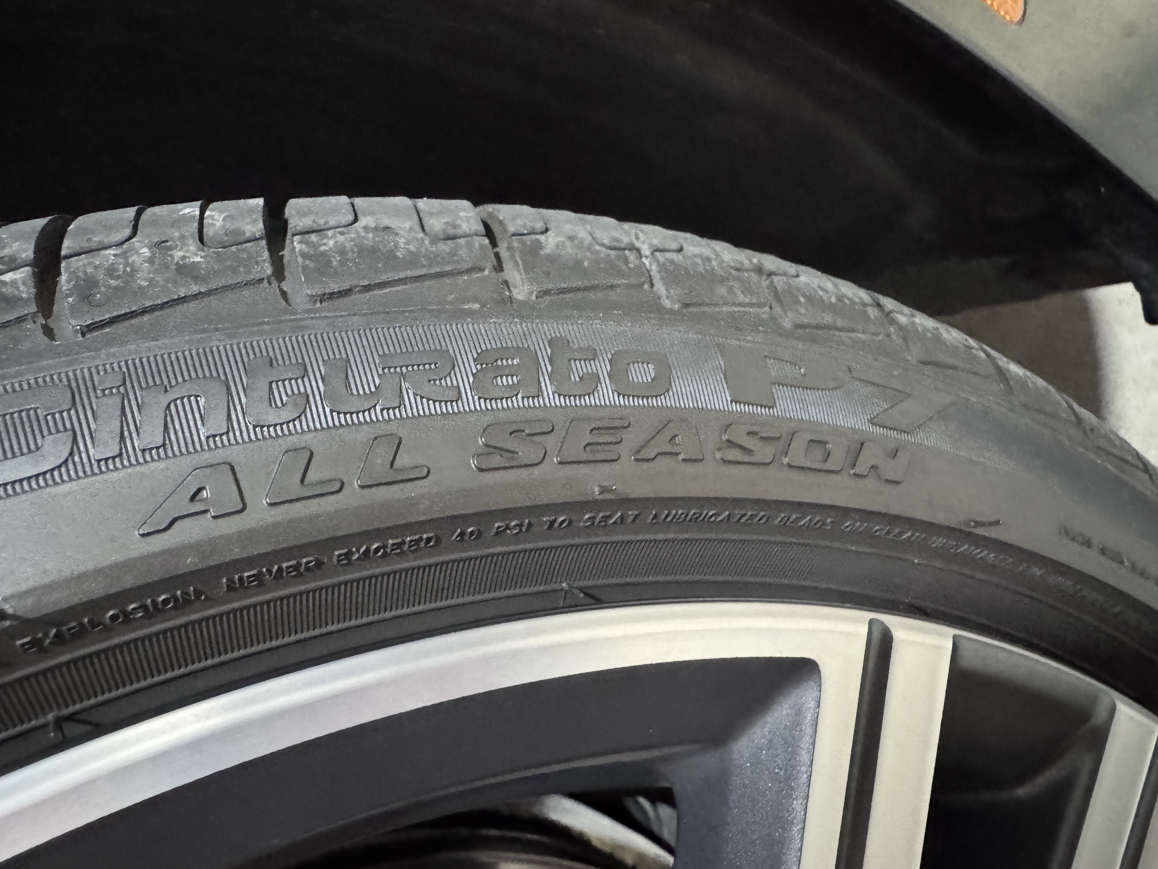 Minimal tread left on tires, will need replacement (Pirelli Sottozero 225/60 R17, run flats); one has nail (see pic) but holds air.