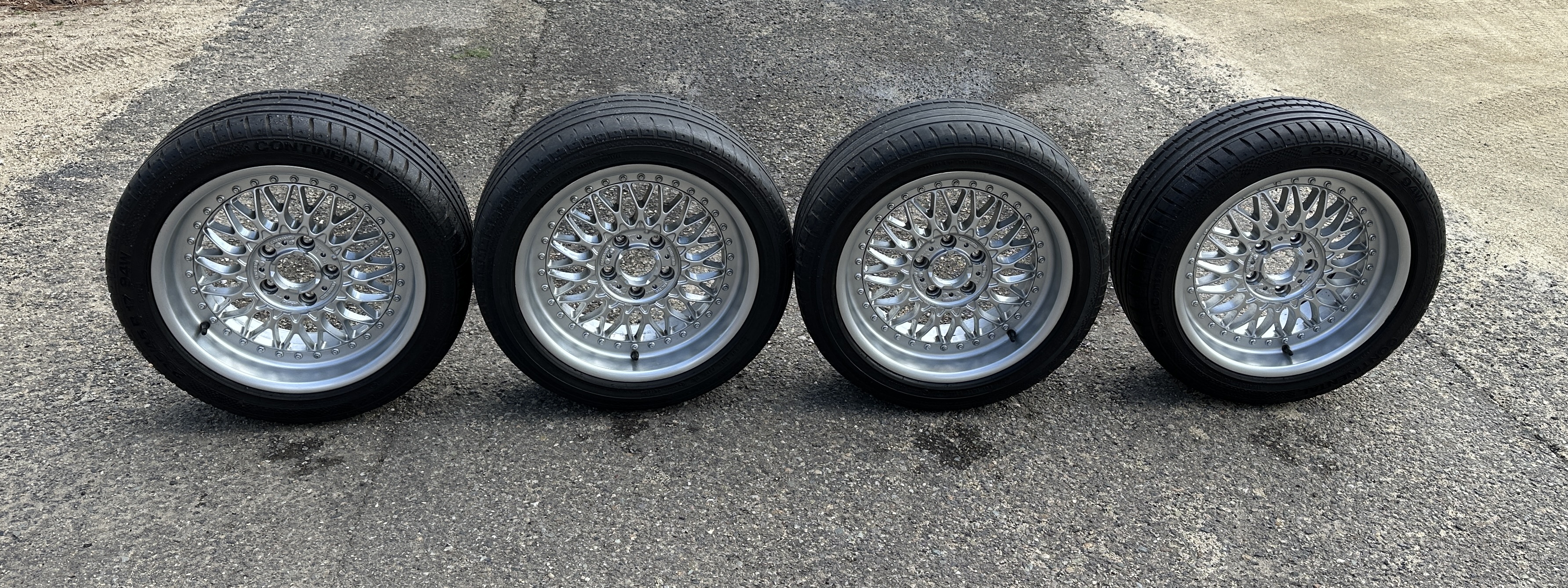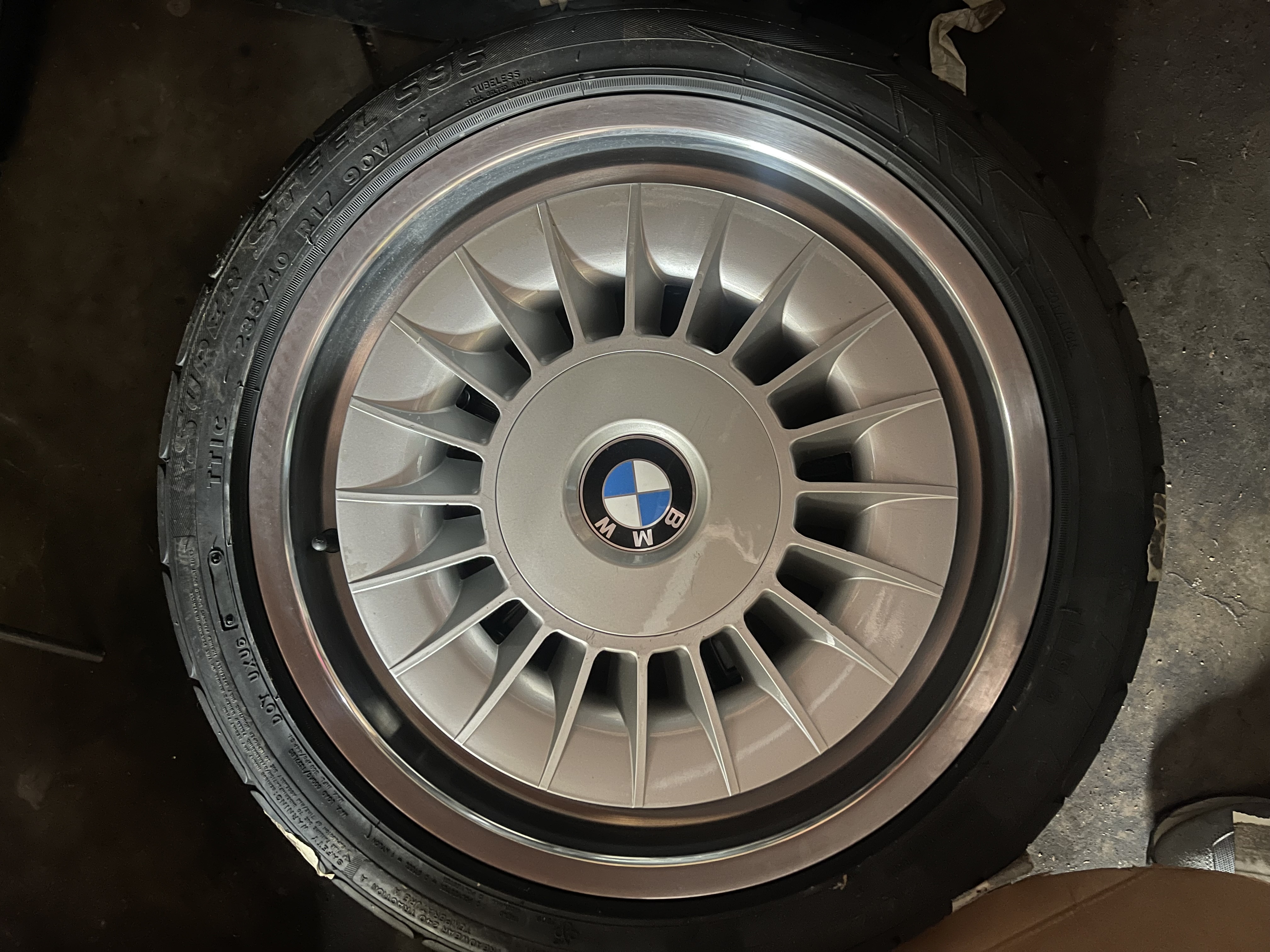 BBS wheels made for BMW in the Style 5 multi piece wheels 8" by 17" with an ET of 20 offset. Wheels in very good condition with only slight imperfections. Tires have aged out and are only for safe guarding the wheels. See photos for condition.