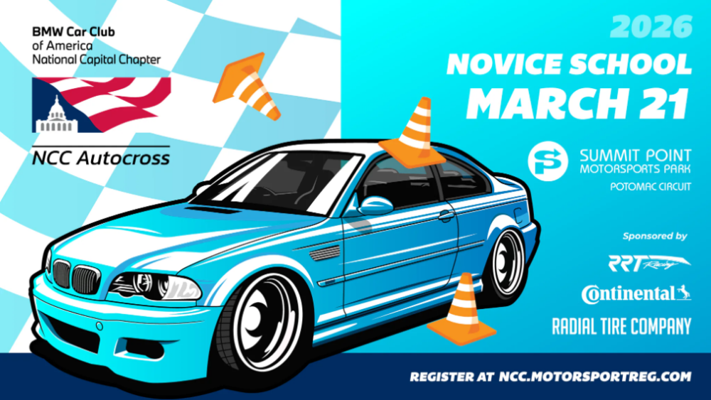 This is the one and only NCC Autocross School for the 2026 Season. Please plan to be on site by 8:30 a.m. and anticipate being "in school" until 4 p.m. on event day. NCC Autocross schools are intended for first time or novice autocross participants that have previously attended no more than 1 school or 5 events. All makes and models are welcome, you just need to be a BMWCCA member (details below).